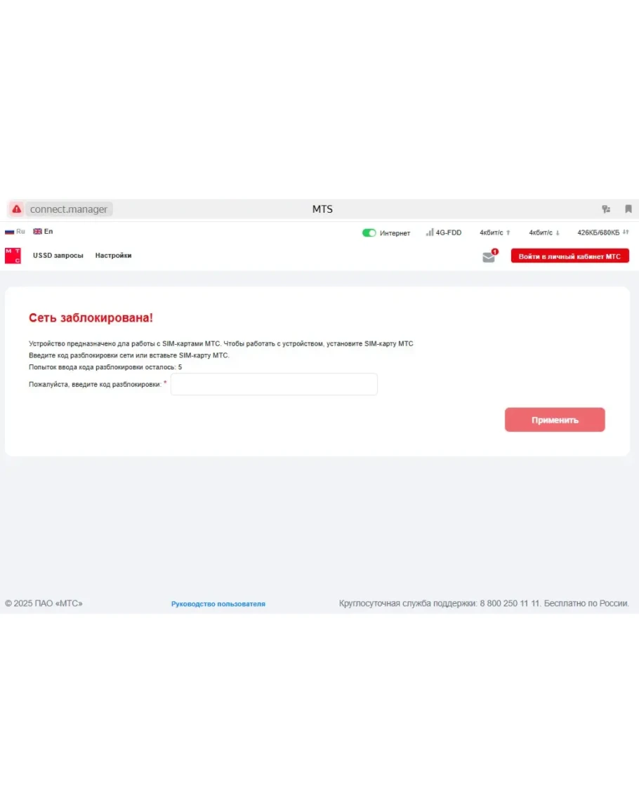 После ввода полученного кода разблокировки в веб-интерфейсе роутера - он начинает работать с SIM картами любых операторов.