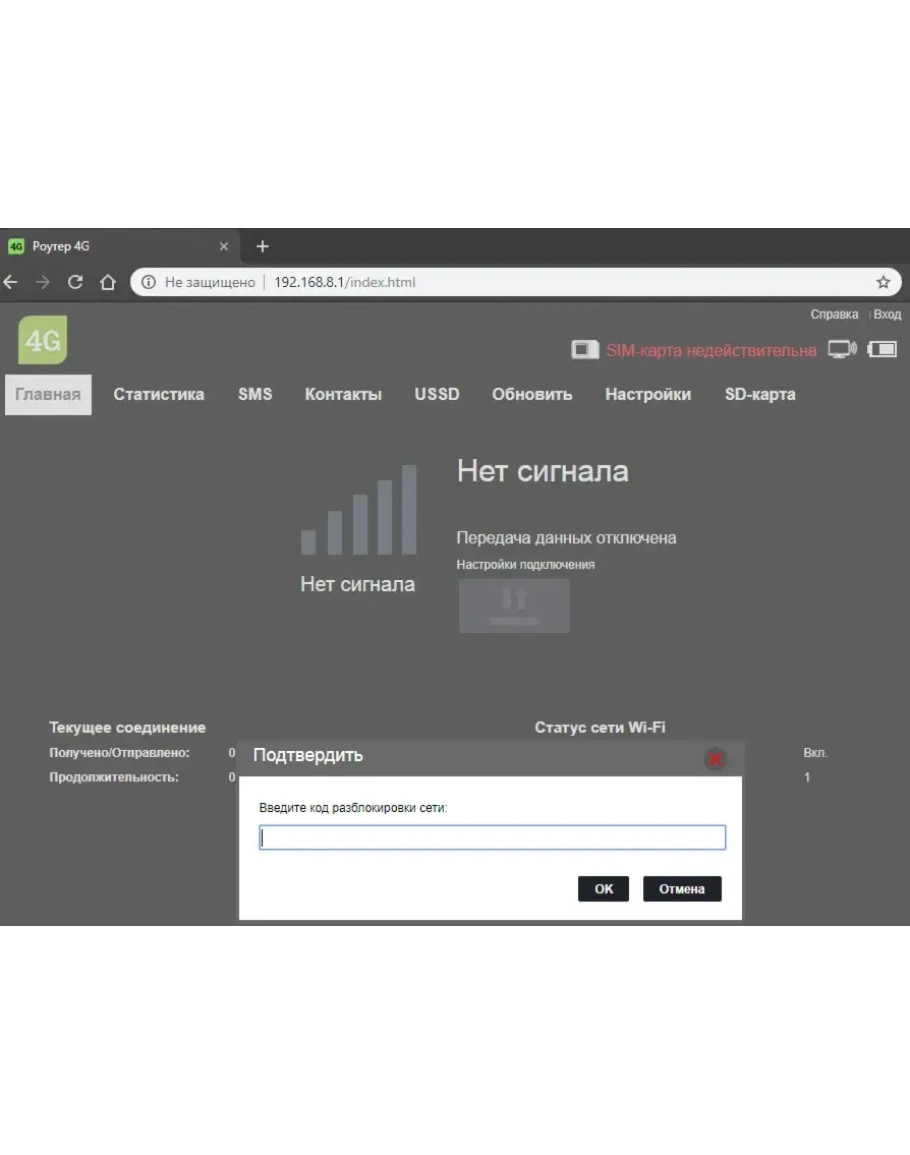 2. Вставьте в устройство SIM карту другого оператора и войдите в web-интерфейс на страницу разблокировки устройства .