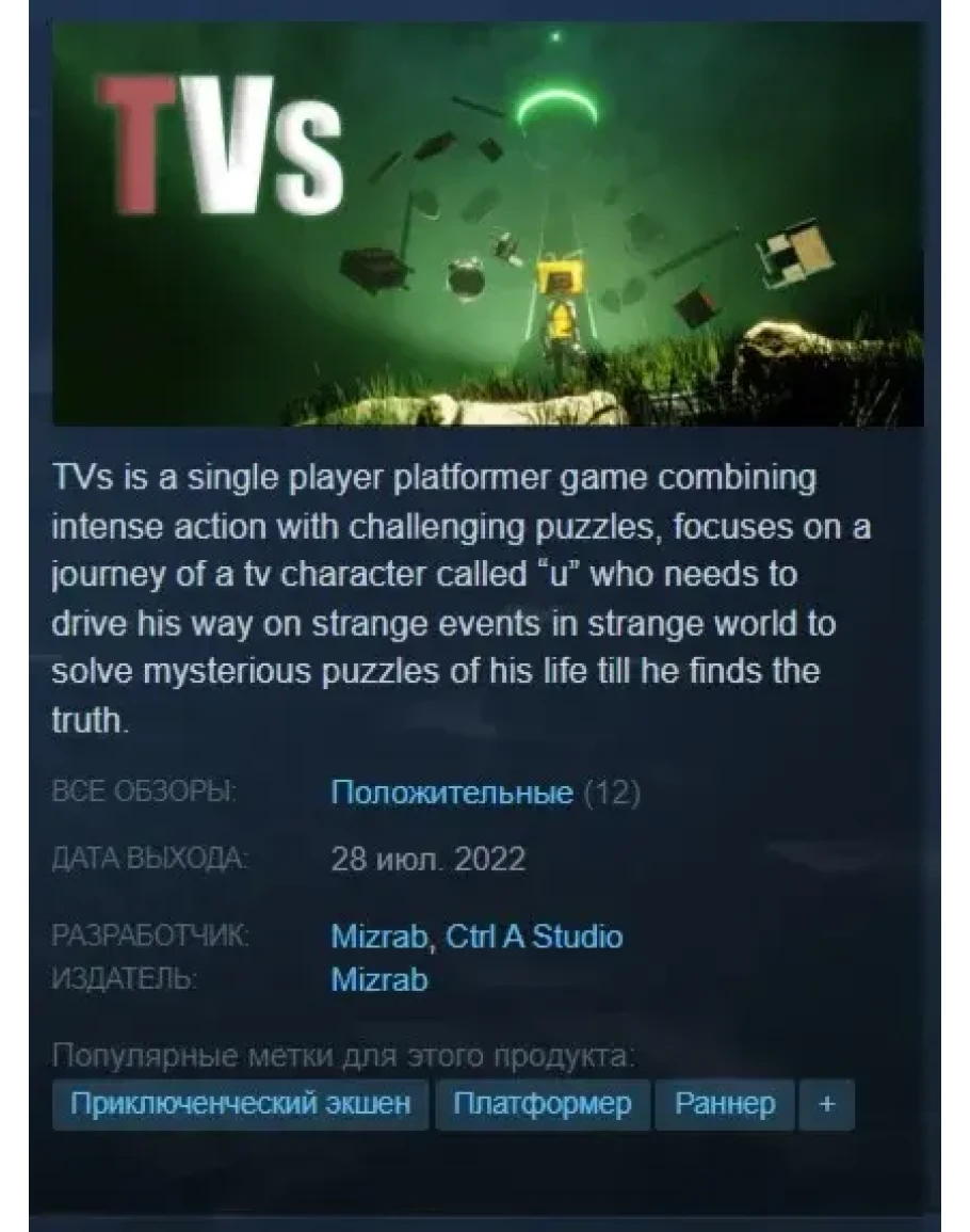 📻«TVs» — это однопользовательский платформер, посвящённый путешествию телевизионного персонажа по имени “u”, которому нужно пройти свой путь по странным местам, чтобы разгадать таинственные головоломки и найти правду. Порой, неизвестный персонаж появляется перед игроком на экранах телевизоров и радиоприемников в игровой среде и разговаривает с игроком, направляя его.