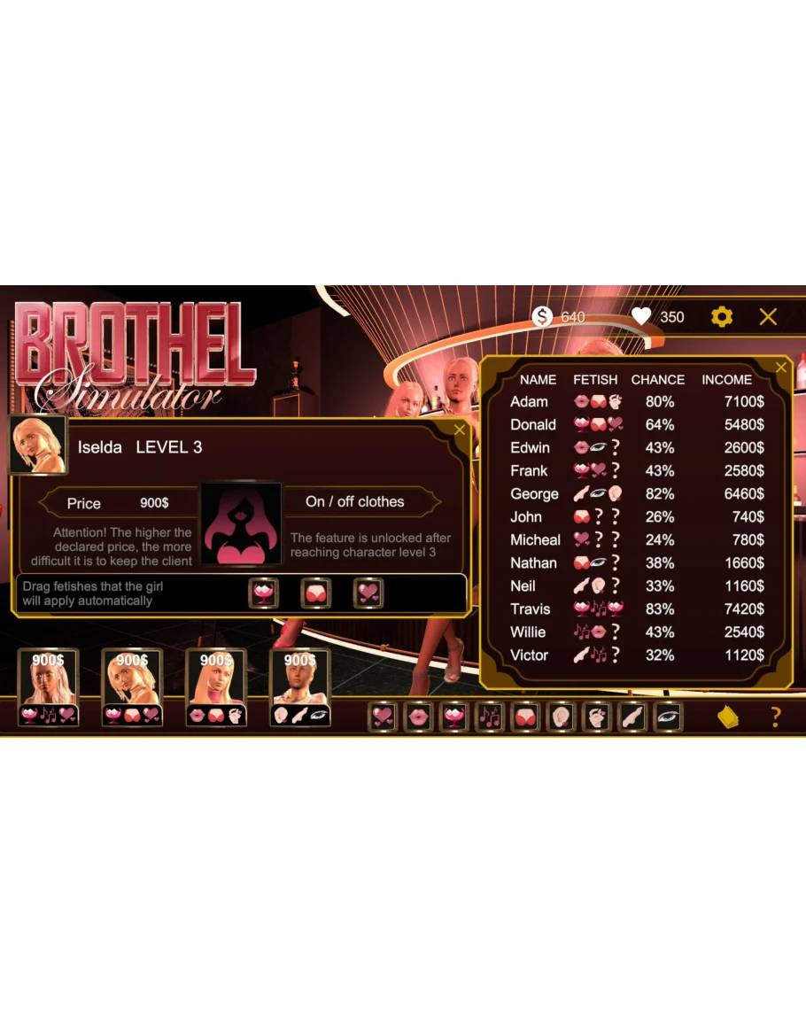 In Brothel Simulator you must master the art of pleasing your clients by teaching your ladies their desired fetishes and keeping track of your regular customers. Your goal is to earn enough money to purchase all of the sex scenes in the gallery.