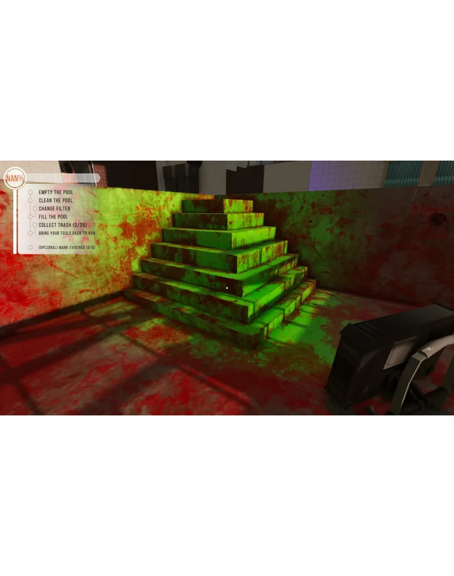 «Симулятор очистки бассейна — это игра по очистке в стиле PowerWash Simulator, в которой вы используете различные инструменты, чтобы сделать грязные бассейны сияющими чистотой». В игре воссоздан весь процесс уборки, чистки и ухода за различными бассейнами.