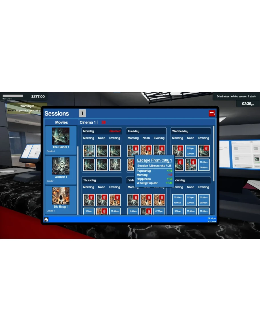 Управляйте своим кинотеатром! Устанавливайте расписание показов, печатайте билеты, покупайте новые фильмы, готовьте попкорн, улучшайте и очищайте залы. Скоро появятся автоматы, персонал, улучшения и многое другое!