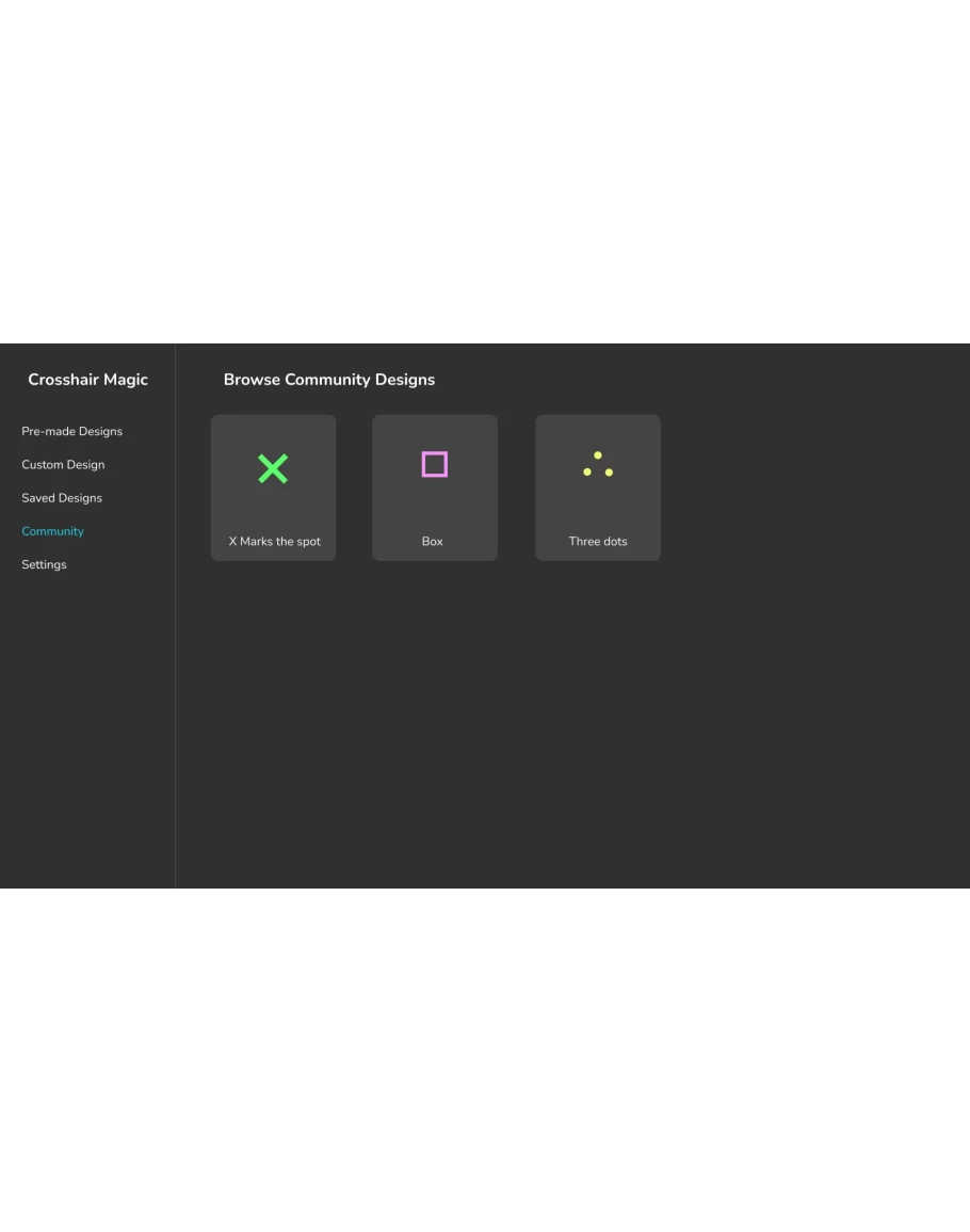 Use a custom crosshair overlay in any game and gain a competitive advantage. Pick from a huge catalog of pre-made crosshairs or create your own.