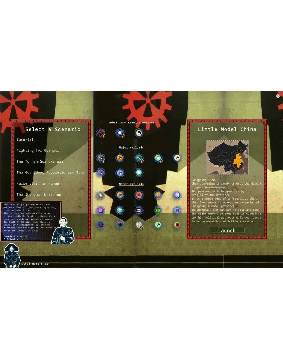 A Giant Strategy Sandbox experience set in Warlord China. *Tons of playable factions! *Communist insugrents, * Boxers like rebels, *Greedy warlords, *Mongol riders, *A mad russian baron, *Shanghai gangsters, *And armored trains!