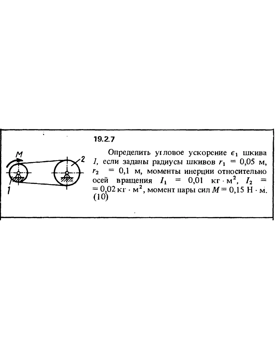 19.2.7. Определить угловое ускорение ε1 шкива 1, если заданы радиусы шкивов r1 = 0,05 м, r2 = 0,1 м, моменты инерции относительно осей вращения I1 = 0,01 кг·м2, I2 = 0,02 кг·м2, момент пары сил М = 0,15 Н·м.