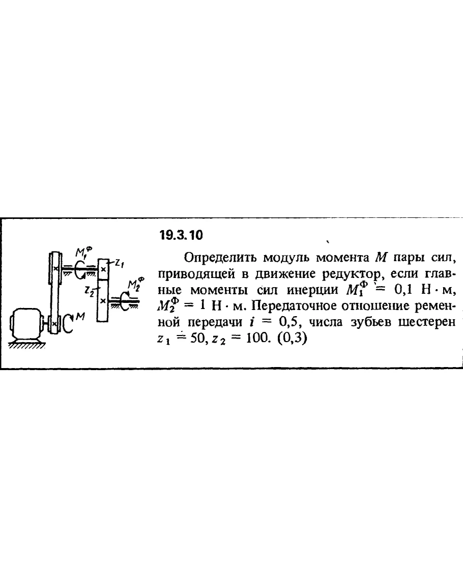 19.3.10. Определить модуль момента М пары сил, приводящей в движение редуктор, если главные моменты сил инерции М1Ф = 0,1 Н·м, М2Ф = 1 Н·м. Передаточное отношение ременной передачи i = 0,5, числа зубьев шестерен z1 = 50, z2 = 100.