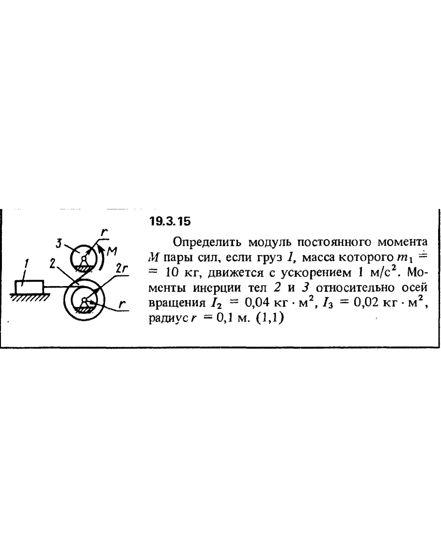 19.3.15. Определить модуль постоянного момента М пары сил, если груз 1, масса которого m1 = 10 кг, движется с ускорением 1 м/с2. Моменты инерции тел 2 и 3 относительно осей вращения I2 = 0,04 кг·м2, I3 = 0,02 кг·м2, радиус r = 0,1 м.