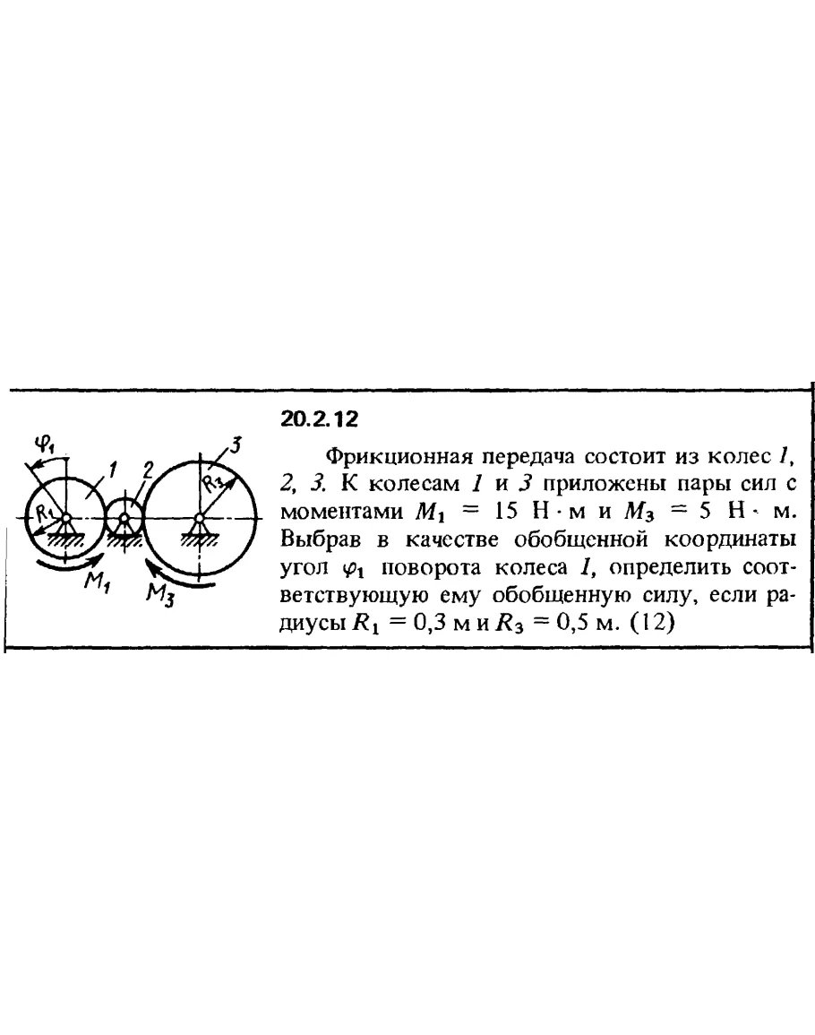 20.2.12. Фрикционная передача состоит из колес 1, 2, 3. К колесам 1 и 3 приложены пары сил с моментами М1 = 15 Н·м и М3 = 5 Н·м. Выбрав в качестве обобщенной координаты угол поворота колеса 1, определить соответствующую ему обобщенную силу, если радиусы R1 = 0,3 м и R3 = 0,5 м.