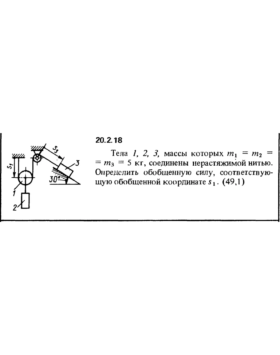20.2.18. Тела 1, 2, 3, массы которых m1 = m2 = m3 = 5 кг, соединены нерастяжимой нитью. Определить обобщенную силу, соответствующую обобщенной координате s1.
