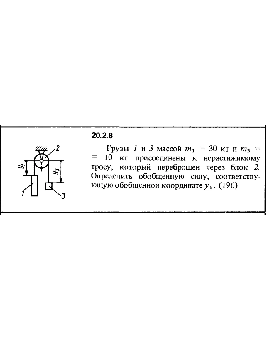 20.2.8. Грузы 1 и 3 массой m1 = 30 кг и m3 = 10 кг присоединены к нерастяжимому тросу, который переброшен через блок 2. Определить обобщенную силу, соответствующую обобщенной координате у1.