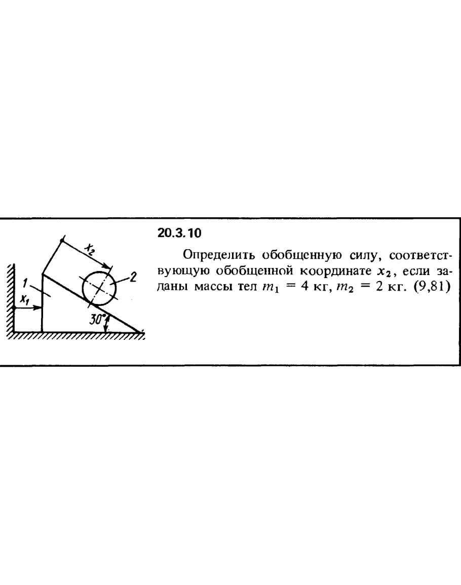 20.3.10. Определить обобщенную силу, соответствующую обобщенной координате х2, если заданы массы тел m1 = 4 кг, m2 = 2 кг.