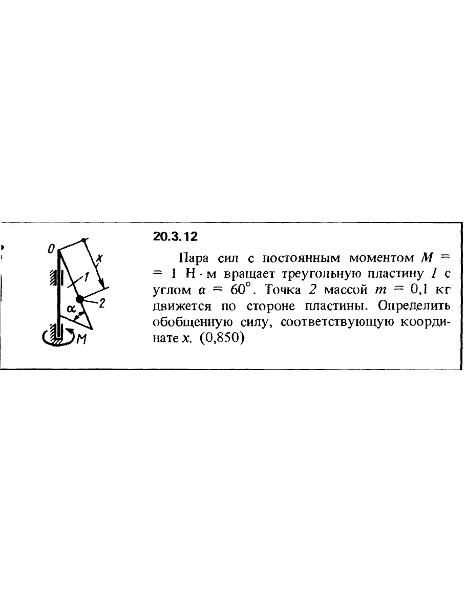 20.3.12. Пара сил с постоянным моментом М = 1 Н·м вращает треугольную пластину 1 с углом α = 60°. Точка 2 массой m = 0,1 кг движется по стороне пластины. Определить обобщенную силу, соответствующую координате х.