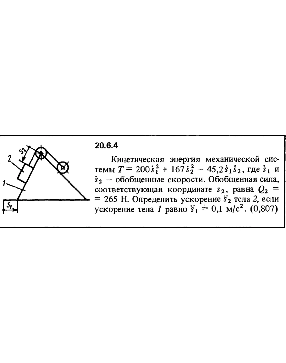 20.6.4. Кинетическая энергия механической системы Т = 200s12 + 167s22 - 45,2s1s2, где s1 и s2 - обобщенные скорости. Обобщенная сила, соответствующая координате s2, равна Q2 = 265 Н. Определить ускорение s2 тела 2, если ускорение тела 1 равно s1 = 0,1 м/с2.
