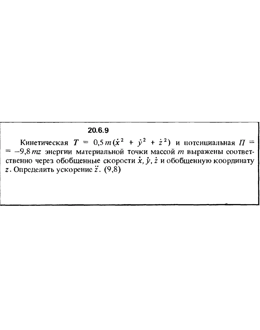 20.6.9. Кинетическая Т = 0,5m(х2 + у2 + z2) и потенциальная П = -9,8mz энергии материальной точки массой m выражены соответственно через обобщенные скорости х, у, z и обобщенную координату z. Определить ускорение z.