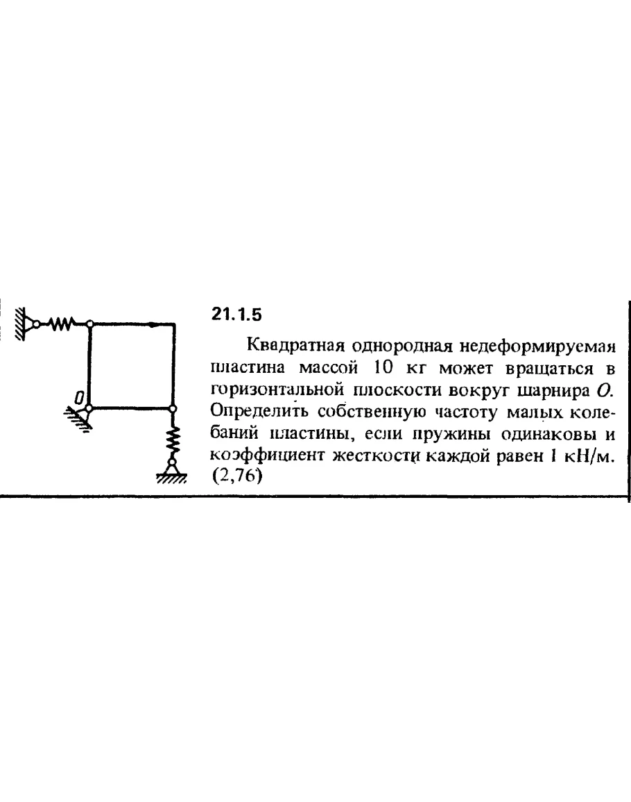 21.1.5. Квадратная однородная недеформируемая пластина массой 10 кг может вращаться в горизонтальной плоскости вокруг шарнира О. Определить собственную частоту малых колебаний пластины, если пружины одинаковы и коэффициент жесткости каждой равен 1 кН/м.