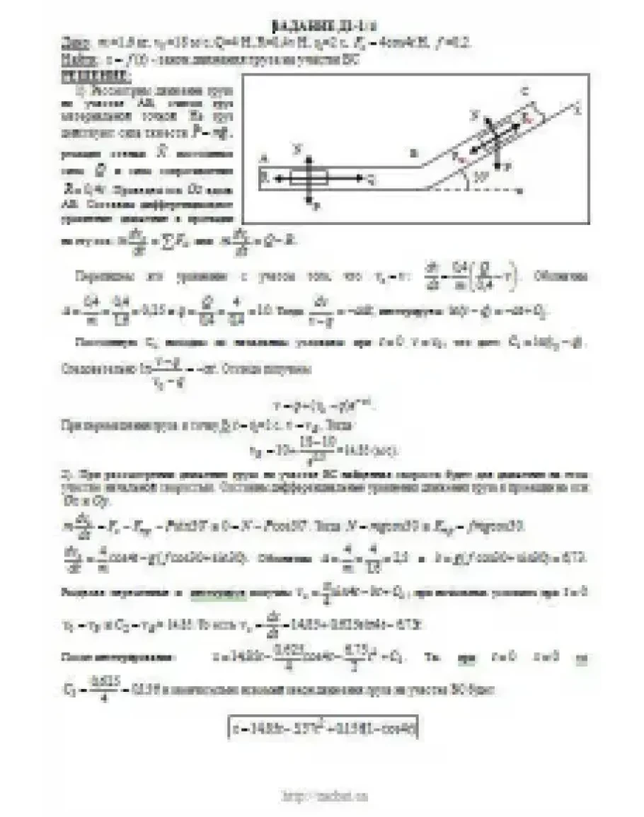 Груз D массой m, получив в точке A начальную скорость v0 движется в изогнутой трубе AВС, расположенной в вертикальной плоскости; участки трубы или оба наклонные, или один горизонтальный, а другой наклонный (рис. Д1.0 — Д1.9, табл. Д1). На участке AВ на груз кроме силы тяжести действуют постоянная сила Q (ее направление показано на рисунках) и сила сопротивления среды R, зависящая от скорости v груза (направлена против движения); трением груза о трубу на участке AВ пренебречь. В точке В груз, не изменяя своей скорости, переходит на участок ВС трубы, где на него кроме силы тяжести действуют сила трения (коэффициент трения груза о трубу f = 0,2) и переменная сила F, проекция которой Fx на ось х задана в таблице. Считая груз материальной точкой и зная расстояние AВ = l или время t1 движения груза от точки А до точки В, найти закон движения груза на участке ВС, т. е. х = f(t), где х = BD.