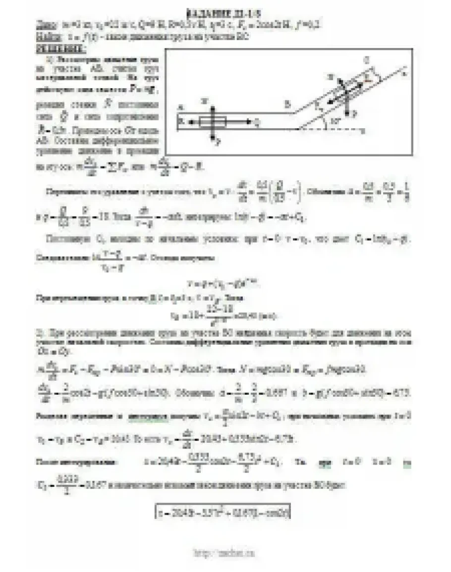 Груз D массой m, получив в точке A начальную скорость v0 движется в изогнутой трубе AВС, расположенной в вертикальной плоскости; участки трубы или оба наклонные, или один горизонтальный, а другой наклонный (рис. Д1.0 — Д1.9, табл. Д1). На участке AВ на груз кроме силы тяжести действуют постоянная сила Q (ее направление показано на рисунках) и сила сопротивления среды R, зависящая от скорости v груза (направлена против движения); трением груза о трубу на участке AВ пренебречь. В точке В груз, не изменяя своей скорости, переходит на участок ВС трубы, где на него кроме силы тяжести действуют сила трения (коэффициент трения груза о трубу f = 0,2) и переменная сила F, проекция которой Fx на ось х задана в таблице. Считая груз материальной точкой и зная расстояние AВ = l или время t1 движения груза от точки А до точки В, найти закон движения груза на участке ВС, т. е. х = f(t), где х = BD.