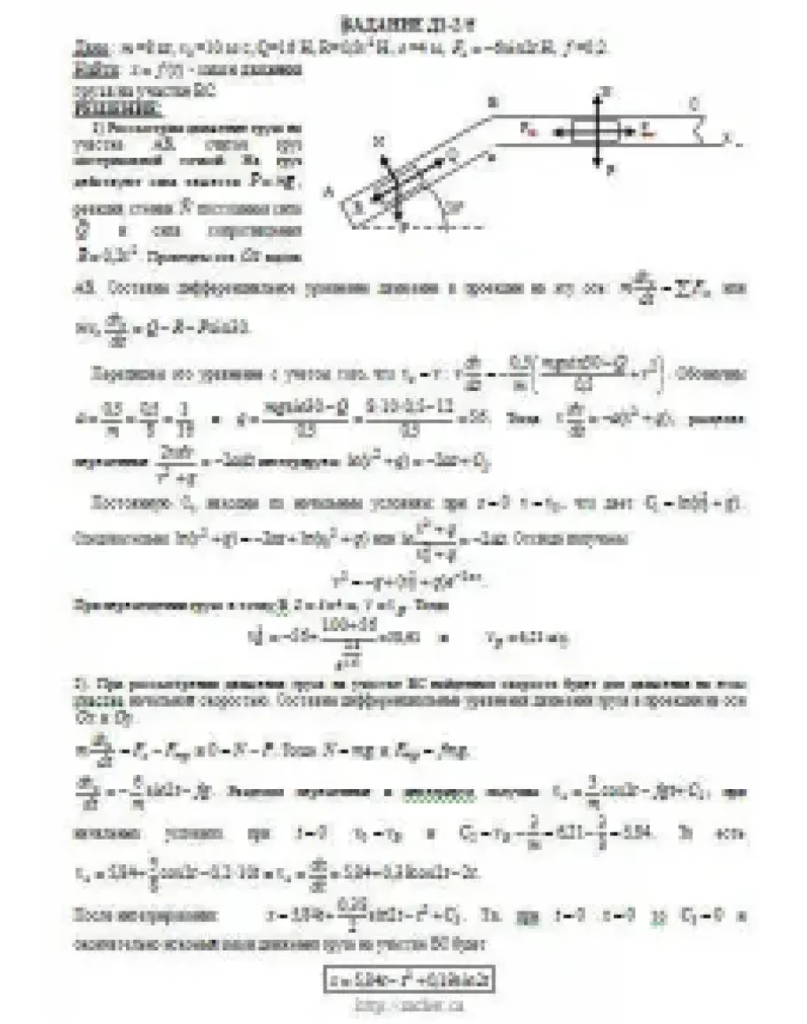 Груз D массой m, получив в точке A начальную скорость v0 движется в изогнутой трубе AВС, расположенной в вертикальной плоскости; участки трубы или оба наклонные, или один горизонтальный, а другой наклонный (рис. Д1.0 — Д1.9, табл. Д1). На участке AВ на груз кроме силы тяжести действуют постоянная сила Q (ее направление показано на рисунках) и сила сопротивления среды R, зависящая от скорости v груза (направлена против движения); трением груза о трубу на участке AВ пренебречь. В точке В груз, не изменяя своей скорости, переходит на участок ВС трубы, где на него кроме силы тяжести действуют сила трения (коэффициент трения груза о трубу f = 0,2) и переменная сила F, проекция которой Fx на ось х задана в таблице. Считая груз материальной точкой и зная расстояние AВ = l или время t1 движения груза от точки А до точки В, найти закон движения груза на участке ВС, т. е. х = f(t), где х = BD.