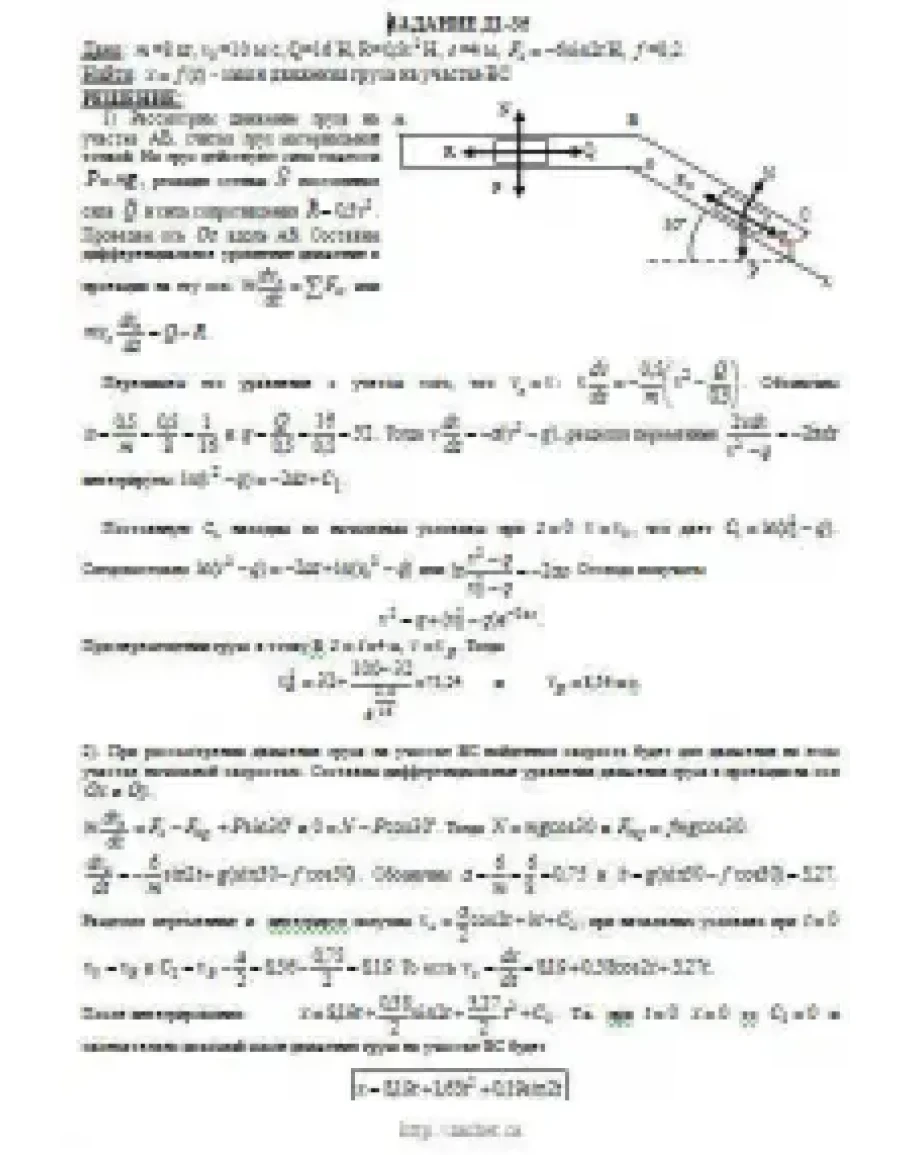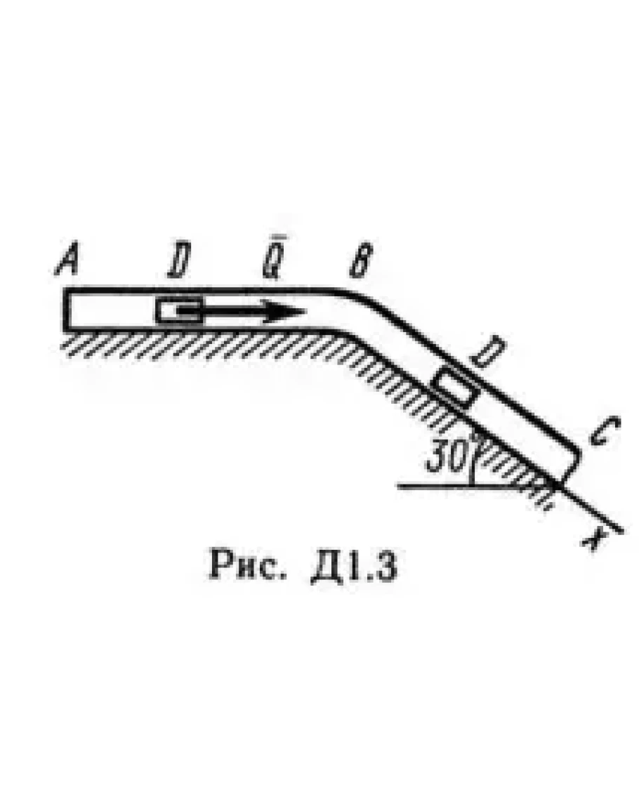 Груз D массой m, получив в точке A начальную скорость v0 движется в изогнутой трубе AВС, расположенной в вертикальной плоскости; участки трубы или оба наклонные, или один горизонтальный, а другой наклонный (рис. Д1.0 — Д1.9, табл. Д1). На участке AВ на груз кроме силы тяжести действуют постоянная сила Q (ее направление показано на рисунках) и сила сопротивления среды R, зависящая от скорости v груза (направлена против движения); трением груза о трубу на участке AВ пренебречь. В точке В груз, не изменяя своей скорости, переходит на участок ВС трубы, где на него кроме силы тяжести действуют сила трения (коэффициент трения груза о трубу f = 0,2) и переменная сила F, проекция которой Fx на ось х задана в таблице. Считая груз материальной точкой и зная расстояние AВ = l или время t1 движения груза от точки А до точки В, найти закон движения груза на участке ВС, т. е. х = f(t), где х = BD.
