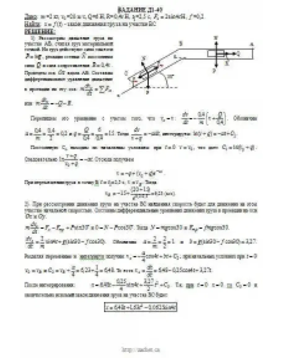 Груз D массой m, получив в точке A начальную скорость v0 движется в изогнутой трубе AВС, расположенной в вертикальной плоскости; участки трубы или оба наклонные, или один горизонтальный, а другой наклонный (рис. Д1.0 — Д1.9, табл. Д1). На участке AВ на груз кроме силы тяжести действуют постоянная сила Q (ее направление показано на рисунках) и сила сопротивления среды R, зависящая от скорости v груза (направлена против движения); трением груза о трубу на участке AВ пренебречь. В точке В груз, не изменяя своей скорости, переходит на участок ВС трубы, где на него кроме силы тяжести действуют сила трения (коэффициент трения груза о трубу f = 0,2) и переменная сила F, проекция которой Fx на ось х задана в таблице. Считая груз материальной точкой и зная расстояние AВ = l или время t1 движения груза от точки А до точки В, найти закон движения груза на участке ВС, т. е. х = f(t), где х = BD.