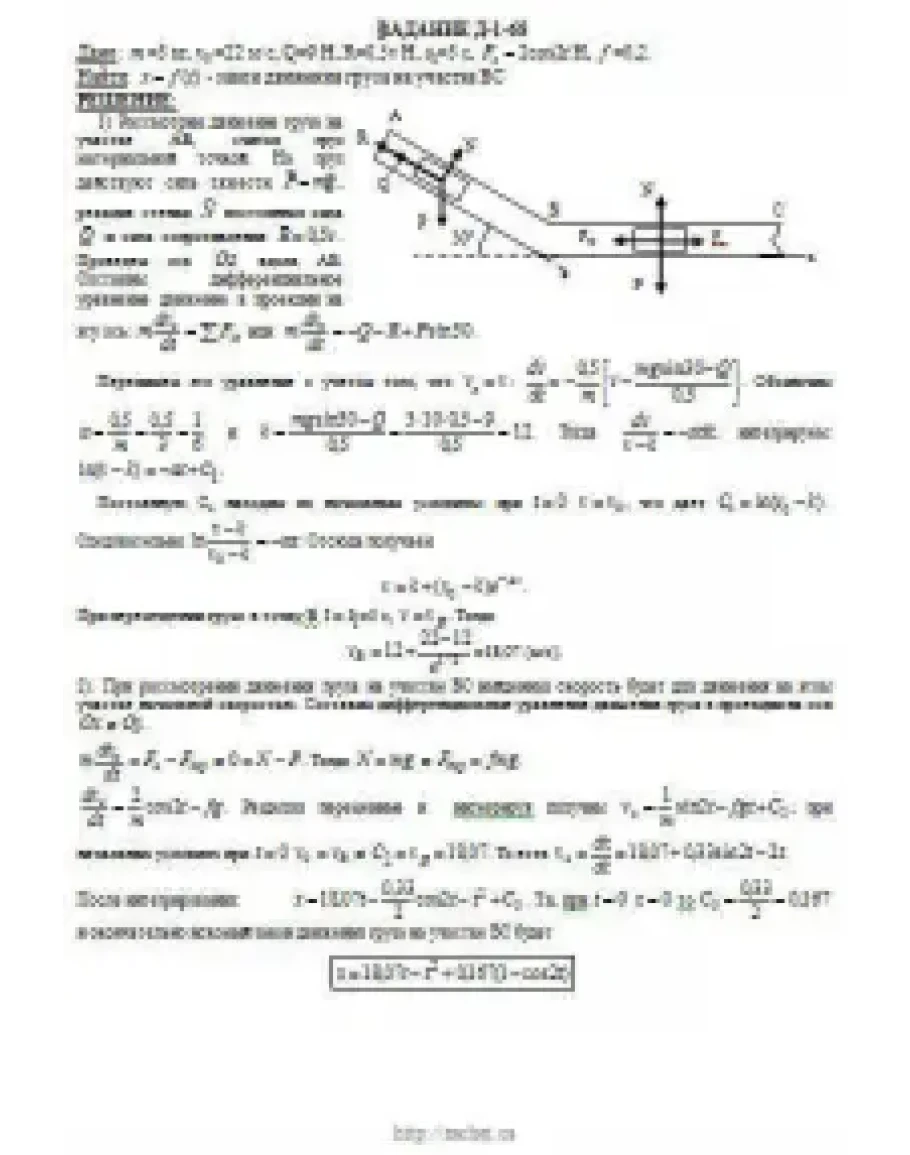 Груз D массой m, получив в точке A начальную скорость v0 движется в изогнутой трубе AВС, расположенной в вертикальной плоскости; участки трубы или оба наклонные, или один горизонтальный, а другой наклонный (рис. Д1.0 — Д1.9, табл. Д1). На участке AВ на груз кроме силы тяжести действуют постоянная сила Q (ее направление показано на рисунках) и сила сопротивления среды R, зависящая от скорости v груза (направлена против движения); трением груза о трубу на участке AВ пренебречь. В точке В груз, не изменяя своей скорости, переходит на участок ВС трубы, где на него кроме силы тяжести действуют сила трения (коэффициент трения груза о трубу f = 0,2) и переменная сила F, проекция которой Fx на ось х задана в таблице. Считая груз материальной точкой и зная расстояние AВ = l или время t1 движения груза от точки А до точки В, найти закон движения груза на участке ВС, т. е. х = f(t), где х = BD.
