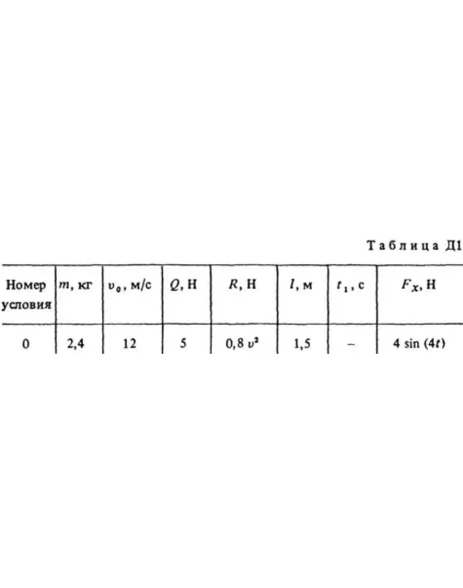 Груз D массой m, получив в точке А начальную скорость v0, движется в изогнутой трубе ABC, расположенной в вертикальной плоскости; участки трубы или оба наклонные, или один горизонтальный, а другой наклонный (рис. Д1.0-Д1.9 табл. Д1). На рисунке АВ на груз кроме силы тяжести действуют постоянная сила Q (ее направление показано на рисунках) и сила сопротивления среды R, зависит от скорости груза v (направлена против движения). В точке В груз, не изменяя значения своей скорости, переходит на участок ВС трубы, где на него кроме силы тяжести действует переменная сила F, проекция которой Fx на ось x задана в таблице. Считая груз материальной точкой и зная расстояние АВ = l или время t1 движения груза от точки А до точки В. Найти закон движения груза на участке ВС, т.е. x = f(t), где x = BD. Трением груза о трубу пренебречь.
