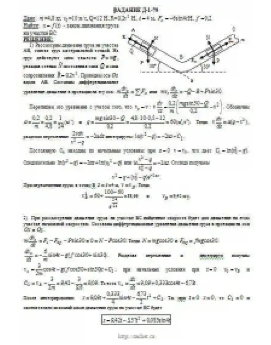 Груз D массой m, получив в точке A начальную скорость v0 движется в изогнутой трубе AВС, расположенной в вертикальной плоскости; участки трубы или оба наклонные, или один горизонтальный, а другой наклонный (рис. Д1.0 — Д1.9, табл. Д1). На участке AВ на груз кроме силы тяжести действуют постоянная сила Q (ее направление показано на рисунках) и сила сопротивления среды R, зависящая от скорости v груза (направлена против движения); трением груза о трубу на участке AВ пренебречь. В точке В груз, не изменяя своей скорости, переходит на участок ВС трубы, где на него кроме силы тяжести действуют сила трения (коэффициент трения груза о трубу f = 0,2) и переменная сила F, проекция которой Fx на ось х задана в таблице. Считая груз материальной точкой и зная расстояние AВ = l или время t1 движения груза от точки А до точки В, найти закон движения груза на участке ВС, т. е. х = f(t), где х = BD.