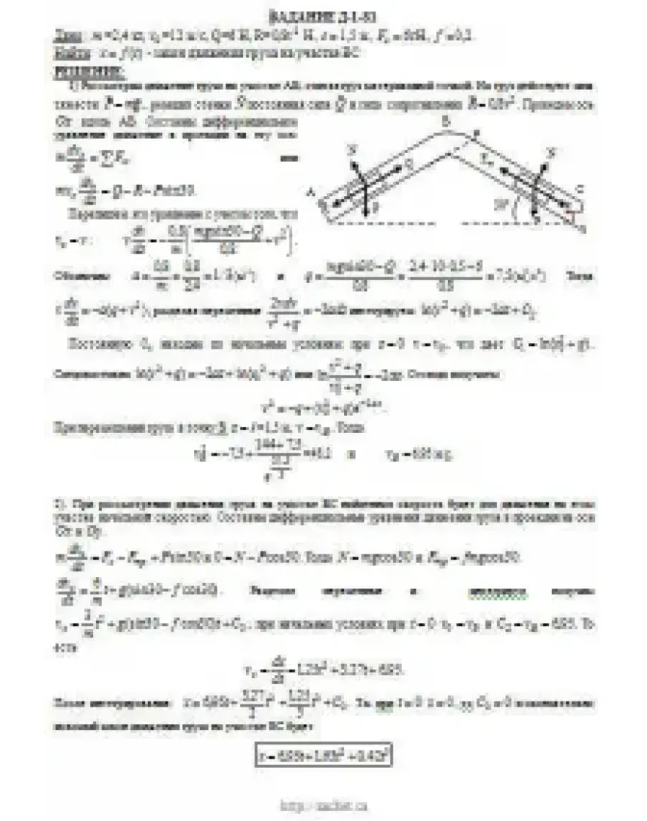 Груз D массой m, получив в точке A начальную скорость v0 движется в изогнутой трубе AВС, расположенной в вертикальной плоскости; участки трубы или оба наклонные, или один горизонтальный, а другой наклонный (рис. Д1.0 — Д1.9, табл. Д1). На участке AВ на груз кроме силы тяжести действуют постоянная сила Q (ее направление показано на рисунках) и сила сопротивления среды R, зависящая от скорости v груза (направлена против движения); трением груза о трубу на участке AВ пренебречь. В точке В груз, не изменяя своей скорости, переходит на участок ВС трубы, где на него кроме силы тяжести действуют сила трения (коэффициент трения груза о трубу f = 0,2) и переменная сила F, проекция которой Fx на ось х задана в таблице. Считая груз материальной точкой и зная расстояние AВ = l или время t1 движения груза от точки А до точки В, найти закон движения груза на участке ВС, т. е. х = f(t), где х = BD.