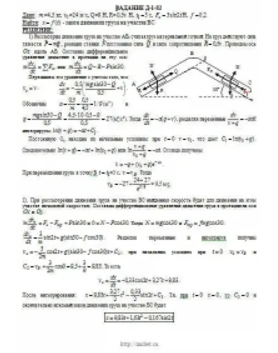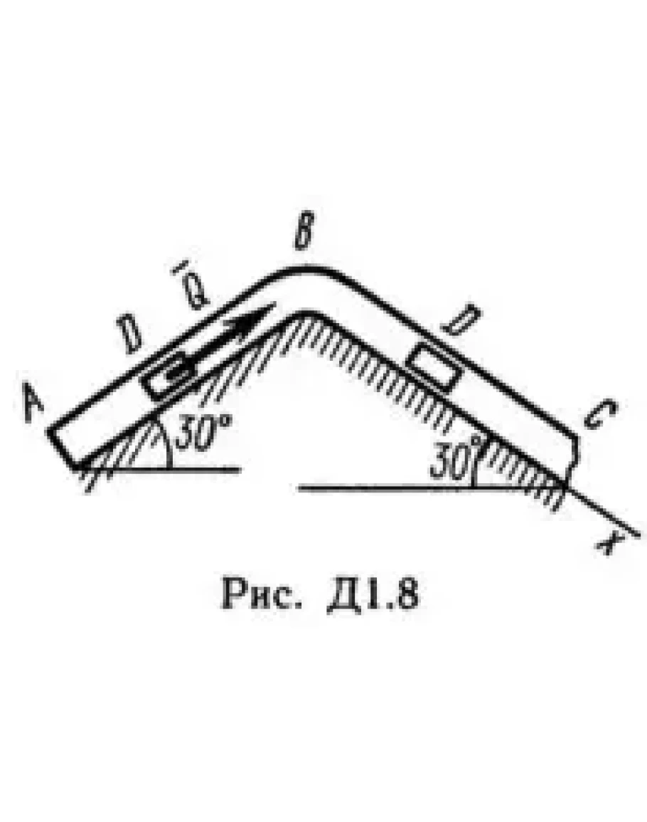 Груз D массой m, получив в точке A начальную скорость v0 движется в изогнутой трубе AВС, расположенной в вертикальной плоскости; участки трубы или оба наклонные, или один горизонтальный, а другой наклонный (рис. Д1.0 — Д1.9, табл. Д1). На участке AВ на груз кроме силы тяжести действуют постоянная сила Q (ее направление показано на рисунках) и сила сопротивления среды R, зависящая от скорости v груза (направлена против движения); трением груза о трубу на участке AВ пренебречь. В точке В груз, не изменяя своей скорости, переходит на участок ВС трубы, где на него кроме силы тяжести действуют сила трения (коэффициент трения груза о трубу f = 0,2) и переменная сила F, проекция которой Fx на ось х задана в таблице. Считая груз материальной точкой и зная расстояние AВ = l или время t1 движения груза от точки А до точки В, найти закон движения груза на участке ВС, т. е. х = f(t), где х = BD.