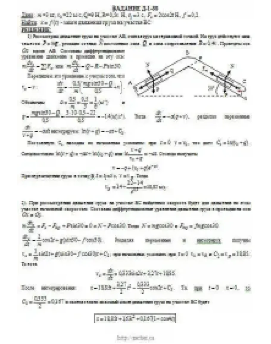 Груз D массой m, получив в точке A начальную скорость v0 движется в изогнутой трубе AВС, расположенной в вертикальной плоскости; участки трубы или оба наклонные, или один горизонтальный, а другой наклонный (рис. Д1.0 — Д1.9, табл. Д1). На участке AВ на груз кроме силы тяжести действуют постоянная сила Q (ее направление показано на рисунках) и сила сопротивления среды R, зависящая от скорости v груза (направлена против движения); трением груза о трубу на участке AВ пренебречь. В точке В груз, не изменяя своей скорости, переходит на участок ВС трубы, где на него кроме силы тяжести действуют сила трения (коэффициент трения груза о трубу f = 0,2) и переменная сила F, проекция которой Fx на ось х задана в таблице. Считая груз материальной точкой и зная расстояние AВ = l или время t1 движения груза от точки А до точки В, найти закон движения груза на участке ВС, т. е. х = f(t), где х = BD.