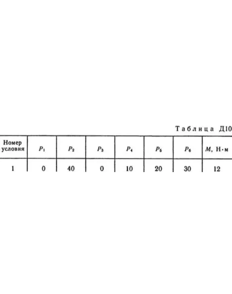 Механическая система состоит из однородных ступенчатых шкивов 1 и 2, обмотанных нитями, грузов 3—6, прикрепленных к этим нитям, и невесомого блока (рис. Д10.0 — Д10.9, табл. Д10). Система движется в вертикальной плоскости под действием сил тяжести и пары сил с моментом М, приложенной к одному из шкивов. Радиусы ступеней шкива 1 равны: R1 = 0,2 м, r1 — 0,1 м, а шкива 2 — R2 = 0,3 м, r2 = 0,15 м; их радиусы инерции относительно осей вращения равны соответственно ρ1 = 0,1 м и ρ2 = 0,2 м. Пренебрегая трением, определить ускорение груза, имеющего больший вес; веса Р1, …, Р6 шкивов и грузов заданы в таблице в ньютонах. Грузы, веса которых равны нулю, на чертеже не изображать (шкивы 1, 2 изображать всегда как части системы).