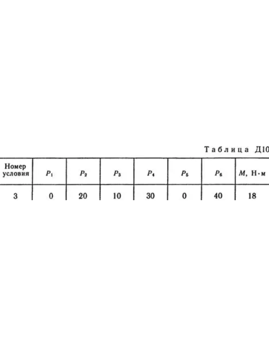 Механическая система состоит из однородных ступенчатых шкивов 1 и 2, обмотанных нитями, грузов 3—6, прикрепленных к этим нитям, и невесомого блока (рис. Д10.0 — Д10.9, табл. Д10). Система движется в вертикальной плоскости под действием сил тяжести и пары сил с моментом М, приложенной к одному из шкивов. Радиусы ступеней шкива 1 равны: R1 = 0,2 м, r1 — 0,1 м, а шкива 2 — R2 = 0,3 м, r2 = 0,15 м; их радиусы инерции относительно осей вращения равны соответственно ρ1 = 0,1 м и ρ2 = 0,2 м. Пренебрегая трением, определить ускорение груза, имеющего больший вес; веса Р1, …, Р6 шкивов и грузов заданы в таблице в ньютонах. Грузы, веса которых равны нулю, на чертеже не изображать (шкивы 1, 2 изображать всегда как части системы).