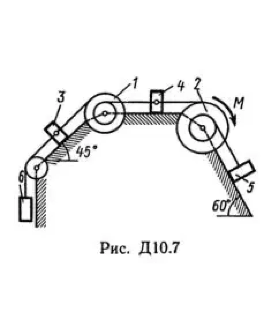 Механическая система состоит из однородных ступенчатых шкивов 1 и 2, обмотанных нитями, грузов 3—6, прикрепленных к этим нитям, и невесомого блока (рис. Д10.0 — Д10.9, табл. Д10). Система движется в вертикальной плоскости под действием сил тяжести и пары сил с моментом М, приложенной к одному из шкивов. Радиусы ступеней шкива 1 равны: R1 = 0,2 м, r1 — 0,1 м, а шкива 2 — R2 = 0,3 м, r2 = 0,15 м; их радиусы инерции относительно осей вращения равны соответственно ρ1 = 0,1 м и ρ2 = 0,2 м. Пренебрегая трением, определить ускорение груза, имеющего больший вес; веса Р1, …, Р6 шкивов и грузов заданы в таблице в ньютонах. Грузы, веса которых равны нулю, на чертеже не изображать (шкивы 1, 2 изображать всегда как части системы).