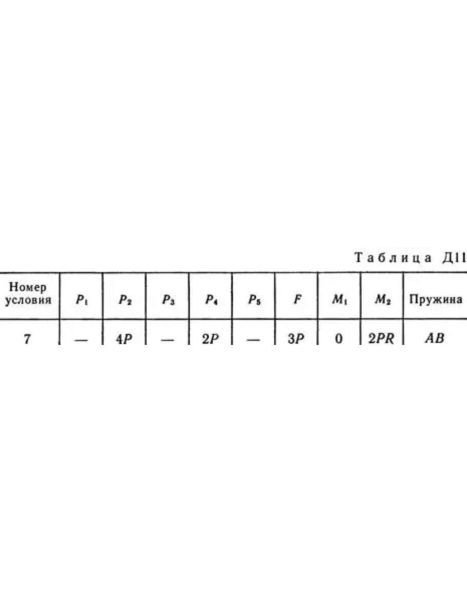 Механическая система состоит из тел 1, 2, …, 5 весом P1, Р2, …, P5 соответственно, связанных друг с другом нитями, намотанными на ступенчатые блоки 1 и 2 (рис. Д11.0 — Д11.9, табл. Д11). Радиусы ступенчатых блоков 1 и 2 равны соответственно R1 = R, r1 = 0,4R, R2 = R, r2 = 0,8R. При вычислении моментов инерции все блоки, катки и колеса считать однородными сплошными цилиндрами радиуса R. На систему кроме сил тяжести действует сила F, приложенная к телу 3 или 4 (если тело 3 в систему не входит, сила приложена в точке В к тележке), и пары сил с моментами М1, M2, приложенные к блокам 1 и 2; когда М<0, направление момента противоположно показанному на рисунке. На участке нити, указанном в таблице в столбце «Пружина», включена пружина с коэффициентом жесткости с (например, если в столбце стоит АВ, то участок АВ является пружиной, если AD, то AD — пружина и т.д.); в начальный момент времени пружина не деформирована. Составить для системы уравнения Лагранжа и найти закон изменения обобщенной координаты x, т. е. x = f(t), считая, что движение начинается из состояния покоя; определить также частоту и период колебаний, совершаемых телами системы при ее движении (о выборе координаты x см. «Указания»). Прочерк в столбцах таблицы, где заданы веса, означает, что соответствующее тело в систему не входит (на чертеже не изображать), а ноль — что тело считается невесомым, но в систему входит; для колес, обозначенных номером 4, Р4 — их общий вес (вес платформы такой тележки не учитывается).