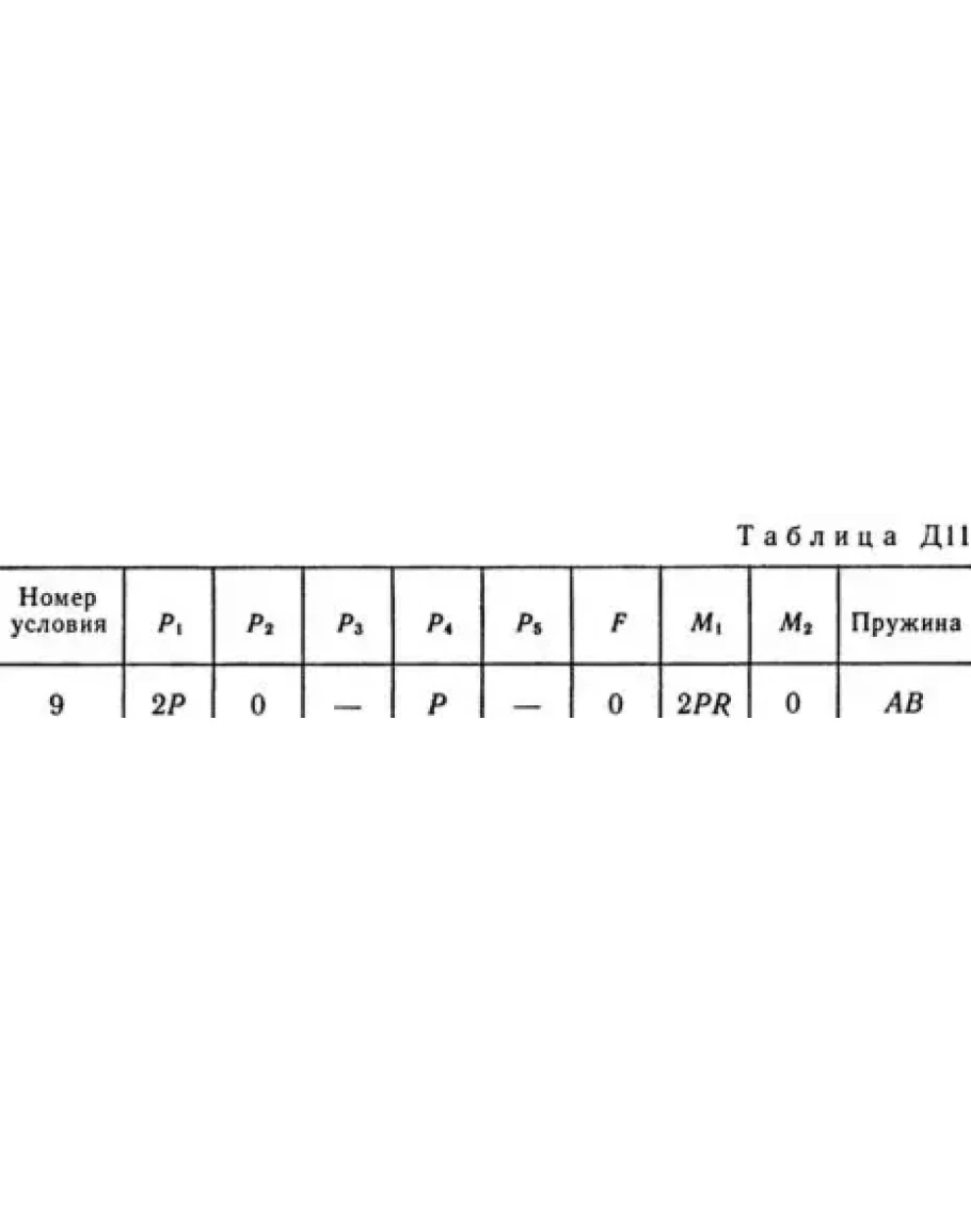 Механическая система состоит из тел 1, 2, …, 5 весом P1, Р2, …, P5 соответственно, связанных друг с другом нитями, намотанными на ступенчатые блоки 1 и 2 (рис. Д11.0 — Д11.9, табл. Д11). Радиусы ступенчатых блоков 1 и 2 равны соответственно R1 = R, r1 = 0,4R, R2 = R, r2 = 0,8R. При вычислении моментов инерции все блоки, катки и колеса считать однородными сплошными цилиндрами радиуса R. На систему кроме сил тяжести действует сила F, приложенная к телу 3 или 4 (если тело 3 в систему не входит, сила приложена в точке В к тележке), и пары сил с моментами М1, M2, приложенные к блокам 1 и 2; когда М<0, направление момента противоположно показанному на рисунке. На участке нити, указанном в таблице в столбце «Пружина», включена пружина с коэффициентом жесткости с (например, если в столбце стоит АВ, то участок АВ является пружиной, если AD, то AD — пружина и т.д.); в начальный момент времени пружина не деформирована. Составить для системы уравнения Лагранжа и найти закон изменения обобщенной координаты x, т. е. x = f(t), считая, что движение начинается из состояния покоя; определить также частоту и период колебаний, совершаемых телами системы при ее движении (о выборе координаты x см. «Указания»). Прочерк в столбцах таблицы, где заданы веса, означает, что соответствующее тело в систему не входит (на чертеже не изображать), а ноль — что тело считается невесомым, но в систему входит; для колес, обозначенных номером 4, Р4 — их общий вес (вес платформы такой тележки не учитывается).