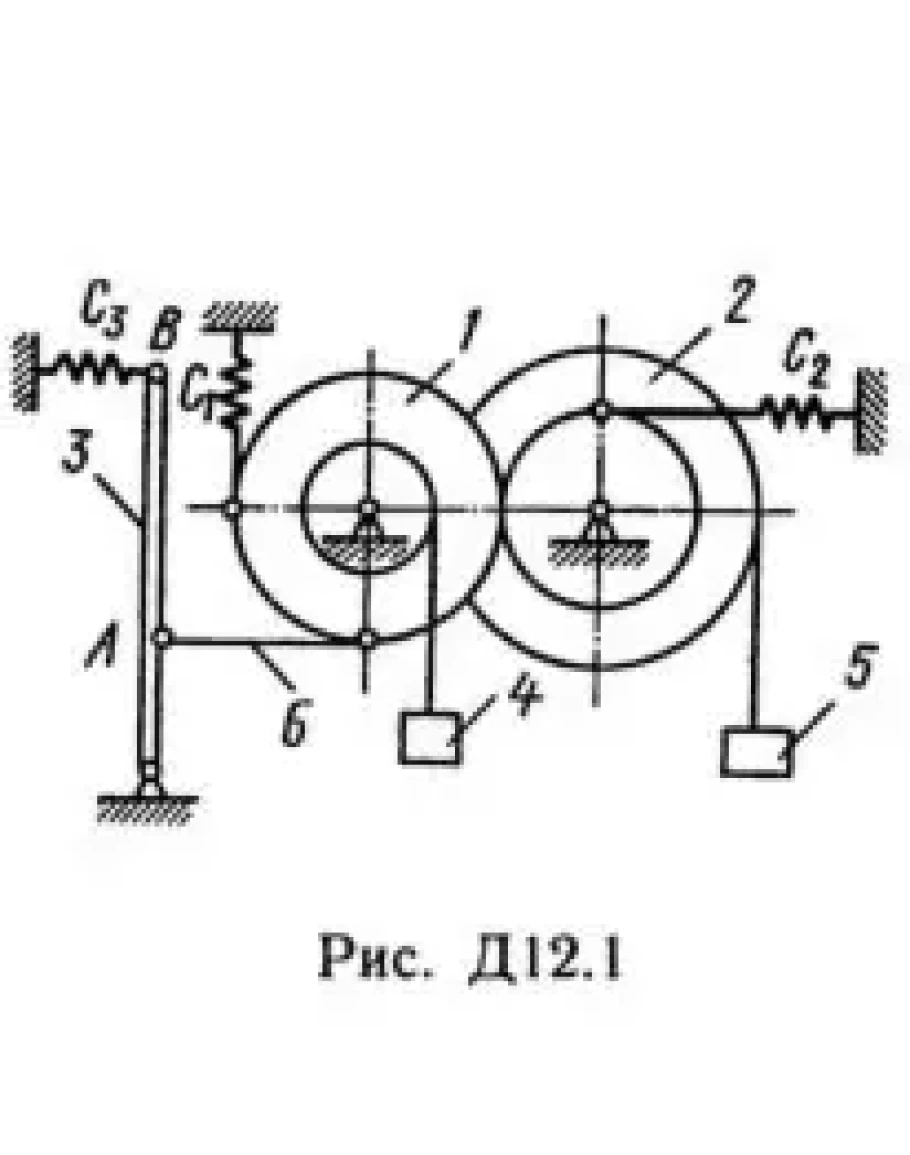 Механизм, расположенный в вертикальной плоскости (рис. Д12.0 — Д12.9), состоит из ступенчатых колес 1 и 2 с радиусами R1 = 0,4 м, r1 = 0,2 м, R2 = 0,5 м, r2 = 0,3 м, имеющих неподвижные оси вращения; однородного стержня 3 длиной l =1,2 м, закрепленного шарниром на одном из концов; грузов 4 и 5, подвешенных к нитям, намотанным на колеса. На стержне расстояние АВ = 2l/3. Стержень 3 соединен с колесом 2 невесомым стержнем 6. Колеса 1 и 2 или находятся в зацеплении (рис. 0—4), или соединены невесомым стержнем 7 (рис. 5—9). К колесам и стержню 3 прикреплены пружины. В табл. Д12 заданы массы mi тел (кг) и коэффициенты жесткости ci пружин (Н/м). Прочерки в столбцах таблицы означают, что соответствующие тела или пружины в систему не входят (на чертеже эти тела и пружины не изображать); в результате в каждом конкретном варианте получается довольно простой механизм, содержащий три или даже два тела. Стержень 6 или 7 входит в состав механизма, когда в него входят оба тела, соединенные этим стержнем. В положениях, изображенных на рисунках, механизм находится в равновесии. Определить частоту и период малых колебаний системы около положения равновесия. Найти также, чему равно статическое удлинение (сжатие) пружины λст в положении равновесия. При подсчетах считать колеса 1 и 2 сплошными однородными цилиндрами радиусов R1 и R2 соответственно. Рассмотрим два примера решения этой задачи.