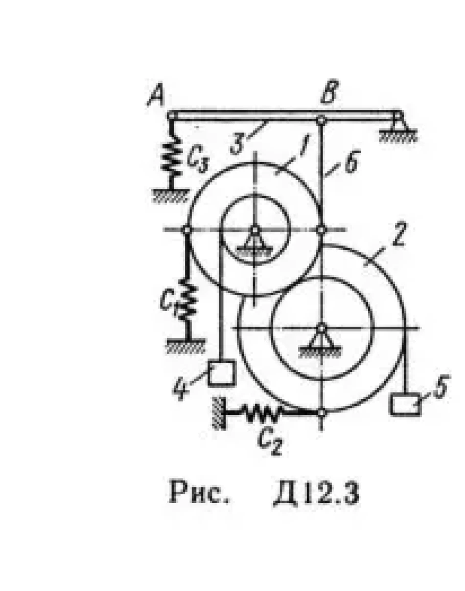 Механизм, расположенный в вертикальной плоскости (рис. Д12.0 — Д12.9), состоит из ступенчатых колес 1 и 2 с радиусами R1 = 0,4 м, r1 = 0,2 м, R2 = 0,5 м, r2 = 0,3 м, имеющих неподвижные оси вращения; однородного стержня 3 длиной l =1,2 м, закрепленного шарниром на одном из концов; грузов 4 и 5, подвешенных к нитям, намотанным на колеса. На стержне расстояние АВ = 2l/3. Стержень 3 соединен с колесом 2 невесомым стержнем 6. Колеса 1 и 2 или находятся в зацеплении (рис. 0—4), или соединены невесомым стержнем 7 (рис. 5—9). К колесам и стержню 3 прикреплены пружины. В табл. Д12 заданы массы mi тел (кг) и коэффициенты жесткости ci пружин (Н/м). Прочерки в столбцах таблицы означают, что соответствующие тела или пружины в систему не входят (на чертеже эти тела и пружины не изображать); в результате в каждом конкретном варианте получается довольно простой механизм, содержащий три или даже два тела. Стержень 6 или 7 входит в состав механизма, когда в него входят оба тела, соединенные этим стержнем. В положениях, изображенных на рисунках, механизм находится в равновесии. Определить частоту и период малых колебаний системы около положения равновесия. Найти также, чему равно статическое удлинение (сжатие) пружины λст в положении равновесия. При подсчетах считать колеса 1 и 2 сплошными однородными цилиндрами радиусов R1 и R2 соответственно. Рассмотрим два примера решения этой задачи.
