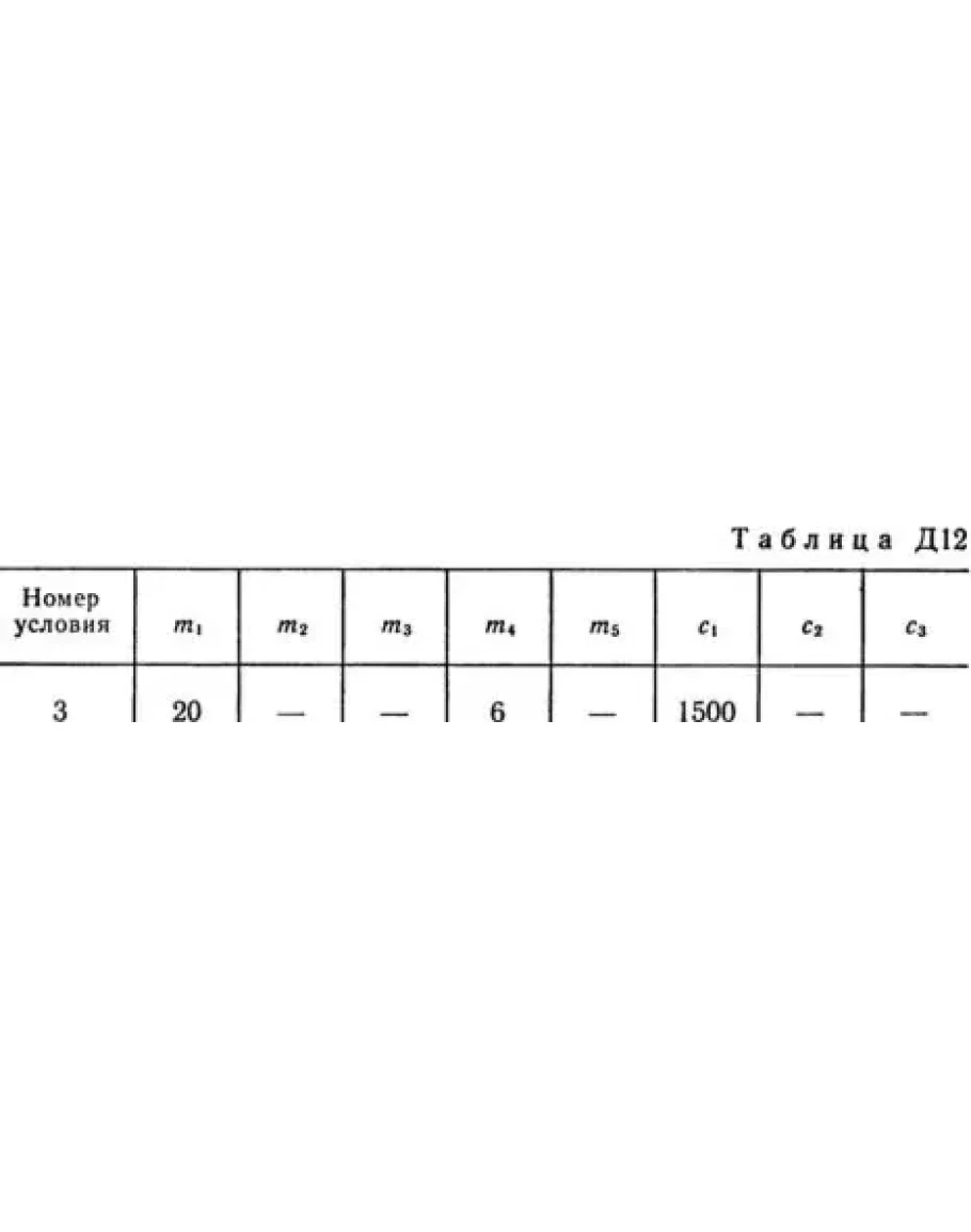 Механизм, расположенный в вертикальной плоскости (рис. Д12.0 — Д12.9), состоит из ступенчатых колес 1 и 2 с радиусами R1 = 0,4 м, r1 = 0,2 м, R2 = 0,5 м, r2 = 0,3 м, имеющих неподвижные оси вращения; однородного стержня 3 длиной l =1,2 м, закрепленного шарниром на одном из концов; грузов 4 и 5, подвешенных к нитям, намотанным на колеса. На стержне расстояние АВ = 2l/3. Стержень 3 соединен с колесом 2 невесомым стержнем 6. Колеса 1 и 2 или находятся в зацеплении (рис. 0—4), или соединены невесомым стержнем 7 (рис. 5—9). К колесам и стержню 3 прикреплены пружины. В табл. Д12 заданы массы mi тел (кг) и коэффициенты жесткости ci пружин (Н/м). Прочерки в столбцах таблицы означают, что соответствующие тела или пружины в систему не входят (на чертеже эти тела и пружины не изображать); в результате в каждом конкретном варианте получается довольно простой механизм, содержащий три или даже два тела. Стержень 6 или 7 входит в состав механизма, когда в него входят оба тела, соединенные этим стержнем. В положениях, изображенных на рисунках, механизм находится в равновесии. Определить частоту и период малых колебаний системы около положения равновесия. Найти также, чему равно статическое удлинение (сжатие) пружины λст в положении равновесия. При подсчетах считать колеса 1 и 2 сплошными однородными цилиндрами радиусов R1 и R2 соответственно. Рассмотрим два примера решения этой задачи.