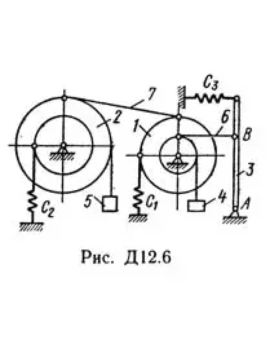 Механизм, расположенный в вертикальной плоскости (рис. Д12.0 — Д12.9), состоит из ступенчатых колес 1 и 2 с радиусами R1 = 0,4 м, r1 = 0,2 м, R2 = 0,5 м, r2 = 0,3 м, имеющих неподвижные оси вращения; однородного стержня 3 длиной l =1,2 м, закрепленного шарниром на одном из концов; грузов 4 и 5, подвешенных к нитям, намотанным на колеса. На стержне расстояние АВ = 2l/3. Стержень 3 соединен с колесом 2 невесомым стержнем 6. Колеса 1 и 2 или находятся в зацеплении (рис. 0—4), или соединены невесомым стержнем 7 (рис. 5—9). К колесам и стержню 3 прикреплены пружины. В табл. Д12 заданы массы mi тел (кг) и коэффициенты жесткости ci пружин (Н/м). Прочерки в столбцах таблицы означают, что соответствующие тела или пружины в систему не входят (на чертеже эти тела и пружины не изображать); в результате в каждом конкретном варианте получается довольно простой механизм, содержащий три или даже два тела. Стержень 6 или 7 входит в состав механизма, когда в него входят оба тела, соединенные этим стержнем. В положениях, изображенных на рисунках, механизм находится в равновесии. Определить частоту и период малых колебаний системы около положения равновесия. Найти также, чему равно статическое удлинение (сжатие) пружины λст в положении равновесия. При подсчетах считать колеса 1 и 2 сплошными однородными цилиндрами радиусов R1 и R2 соответственно. Рассмотрим два примера решения этой задачи.