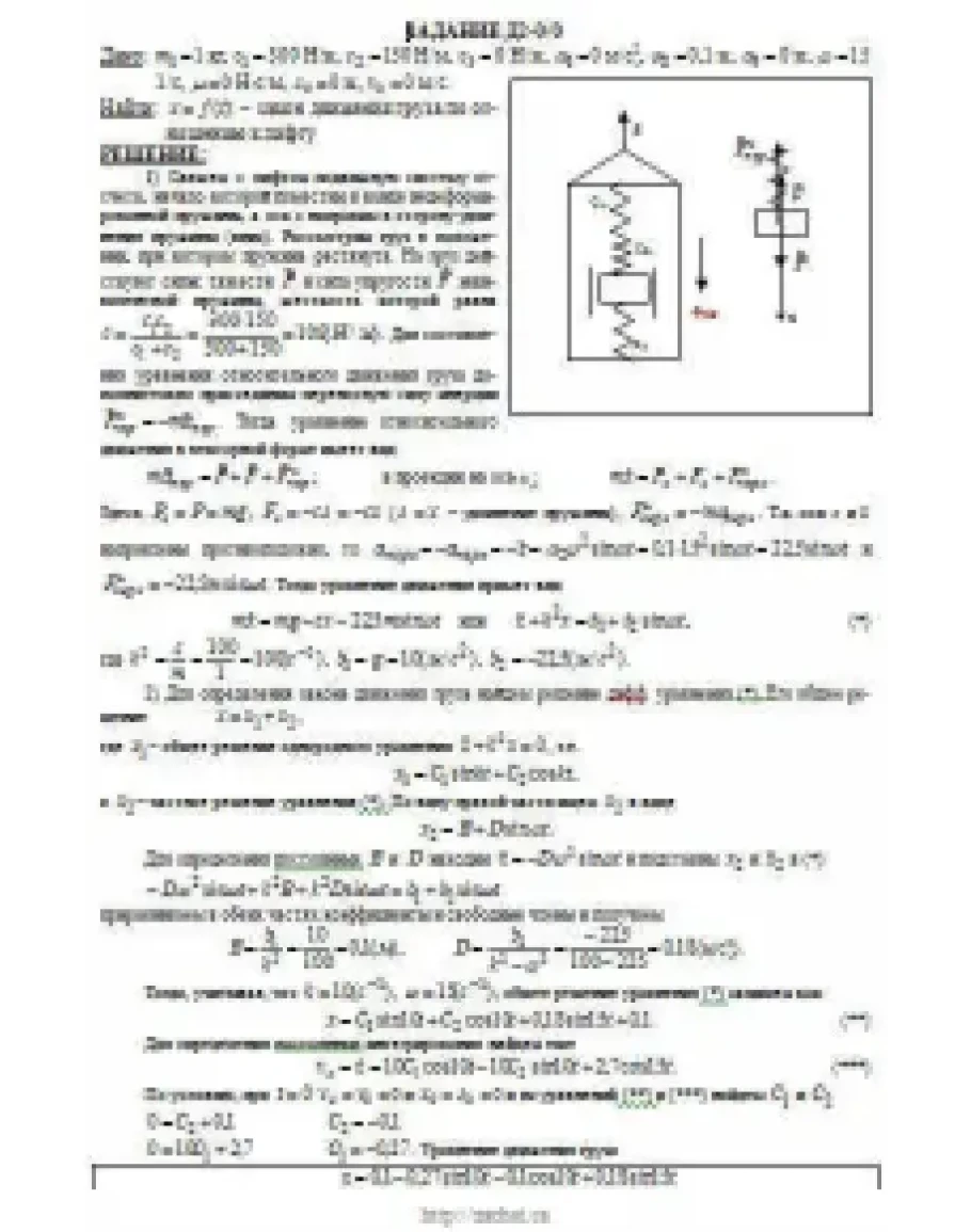 Груз 1 массой m укреплен на пружинной подвеске в лифте (рис. Д2.0 — Д2.9, табл. Д2). Лифт движется вертикально по закону z = 0,5α1t2 + α2sin(ωt) + α3cos(ωt) (ось z направлена по вертикали вверх; z выражено в метрах, t — в секундах). На груз действует сила сопротивления среды R = μv, где v — скорость груза по отношению к лифту. Найти закон движения груза по отношению к лифту, т. е. х = f(t); начало координат поместить в точке, где находится прикрепленный к грузу конец пружины, когда пружина не деформирована. При этом во избежание ошибок в знаках направить ось х в сторону удлинения пружины, а груз изобразить в положении, при котором х>0, т.е. пружина растянута. При подсчетах можно принять g = 10 м/с2. Массой пружин и соединительной планки 2 пренебречь. В таблице обозначено: c1, с2, c3 — коэффициенты жесткости пружин, λ0 — удлинение пружины с эквивалентной жесткостью в начальный момент времени t = 0, v0 — начальная скорость груза по отношению к лифту (направлена вертикально вверх). Прочерк в столбцах c1, с2, c3 означает, что соответствующая пружина отсутствует и на чертеже изображаться не должна. Если при этом конец одной из оставшихся пружин окажется свободным, его следует прикрепить в соответствующем месте или к грузу или к потолку (полу) лифта; то же следует сделать, если свободными окажутся соединенные планкой 2 концы обеих оставшихся пружин. Условие μ = 0 означает, что сила сопротивления R отсутствует.