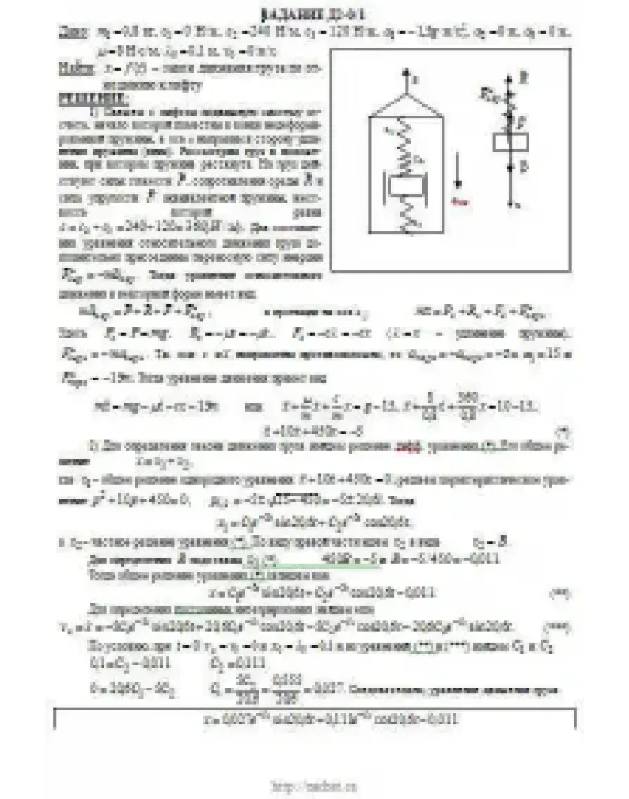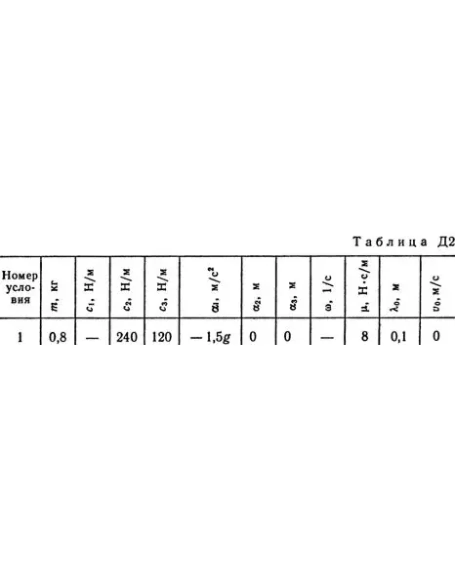 Груз 1 массой m укреплен на пружинной подвеске в лифте (рис. Д2.0 — Д2.9, табл. Д2). Лифт движется вертикально по закону z = 0,5α1t2 + α2sin(ωt) + α3cos(ωt) (ось z направлена по вертикали вверх; z выражено в метрах, t — в секундах). На груз действует сила сопротивления среды R = μv, где v — скорость груза по отношению к лифту. Найти закон движения груза по отношению к лифту, т. е. х = f(t); начало координат поместить в точке, где находится прикрепленный к грузу конец пружины, когда пружина не деформирована. При этом во избежание ошибок в знаках направить ось х в сторону удлинения пружины, а груз изобразить в положении, при котором х>0, т.е. пружина растянута. При подсчетах можно принять g = 10 м/с2. Массой пружин и соединительной планки 2 пренебречь. В таблице обозначено: c1, с2, c3 — коэффициенты жесткости пружин, λ0 — удлинение пружины с эквивалентной жесткостью в начальный момент времени t = 0, v0 — начальная скорость груза по отношению к лифту (направлена вертикально вверх). Прочерк в столбцах c1, с2, c3 означает, что соответствующая пружина отсутствует и на чертеже изображаться не должна. Если при этом конец одной из оставшихся пружин окажется свободным, его следует прикрепить в соответствующем месте или к грузу или к потолку (полу) лифта; то же следует сделать, если свободными окажутся соединенные планкой 2 концы обеих оставшихся пружин. Условие μ = 0 означает, что сила сопротивления R отсутствует.
