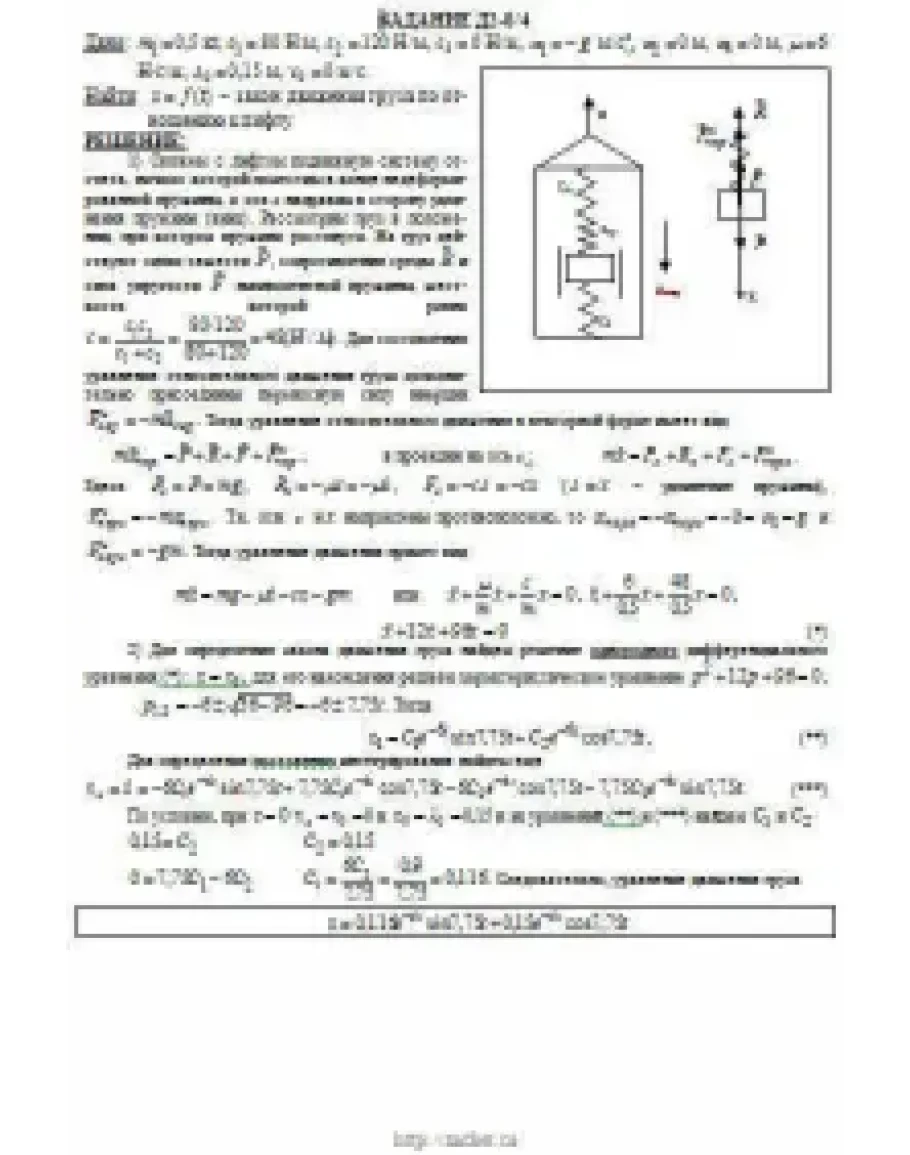 Груз 1 массой m укреплен на пружинной подвеске в лифте (рис. Д2.0 — Д2.9, табл. Д2). Лифт движется вертикально по закону z = 0,5α1t2 + α2sin(ωt) + α3cos(ωt) (ось z направлена по вертикали вверх; z выражено в метрах, t — в секундах). На груз действует сила сопротивления среды R = μv, где v — скорость груза по отношению к лифту. Найти закон движения груза по отношению к лифту, т. е. х = f(t); начало координат поместить в точке, где находится прикрепленный к грузу конец пружины, когда пружина не деформирована. При этом во избежание ошибок в знаках направить ось х в сторону удлинения пружины, а груз изобразить в положении, при котором х>0, т.е. пружина растянута. При подсчетах можно принять g = 10 м/с2. Массой пружин и соединительной планки 2 пренебречь. В таблице обозначено: c1, с2, c3 — коэффициенты жесткости пружин, λ0 — удлинение пружины с эквивалентной жесткостью в начальный момент времени t = 0, v0 — начальная скорость груза по отношению к лифту (направлена вертикально вверх). Прочерк в столбцах c1, с2, c3 означает, что соответствующая пружина отсутствует и на чертеже изображаться не должна. Если при этом конец одной из оставшихся пружин окажется свободным, его следует прикрепить в соответствующем месте или к грузу или к потолку (полу) лифта; то же следует сделать, если свободными окажутся соединенные планкой 2 концы обеих оставшихся пружин. Условие μ = 0 означает, что сила сопротивления R отсутствует.