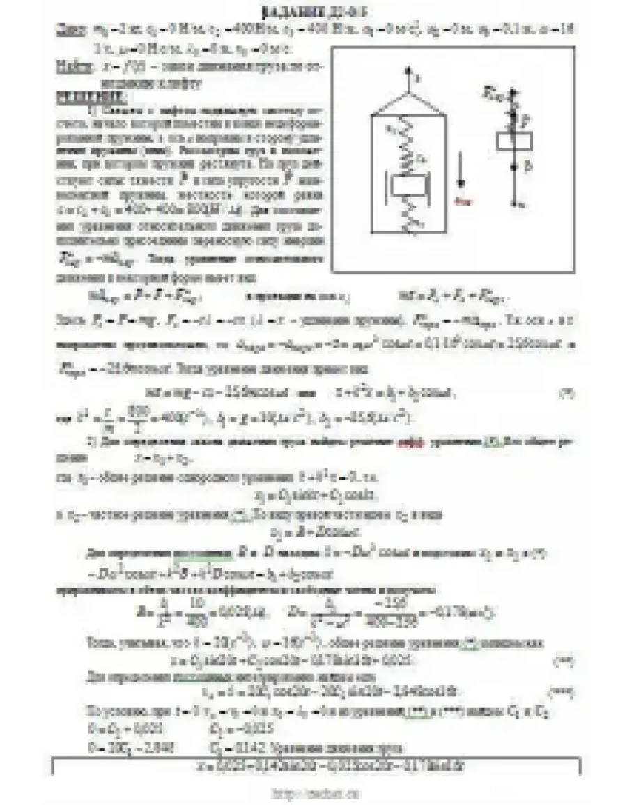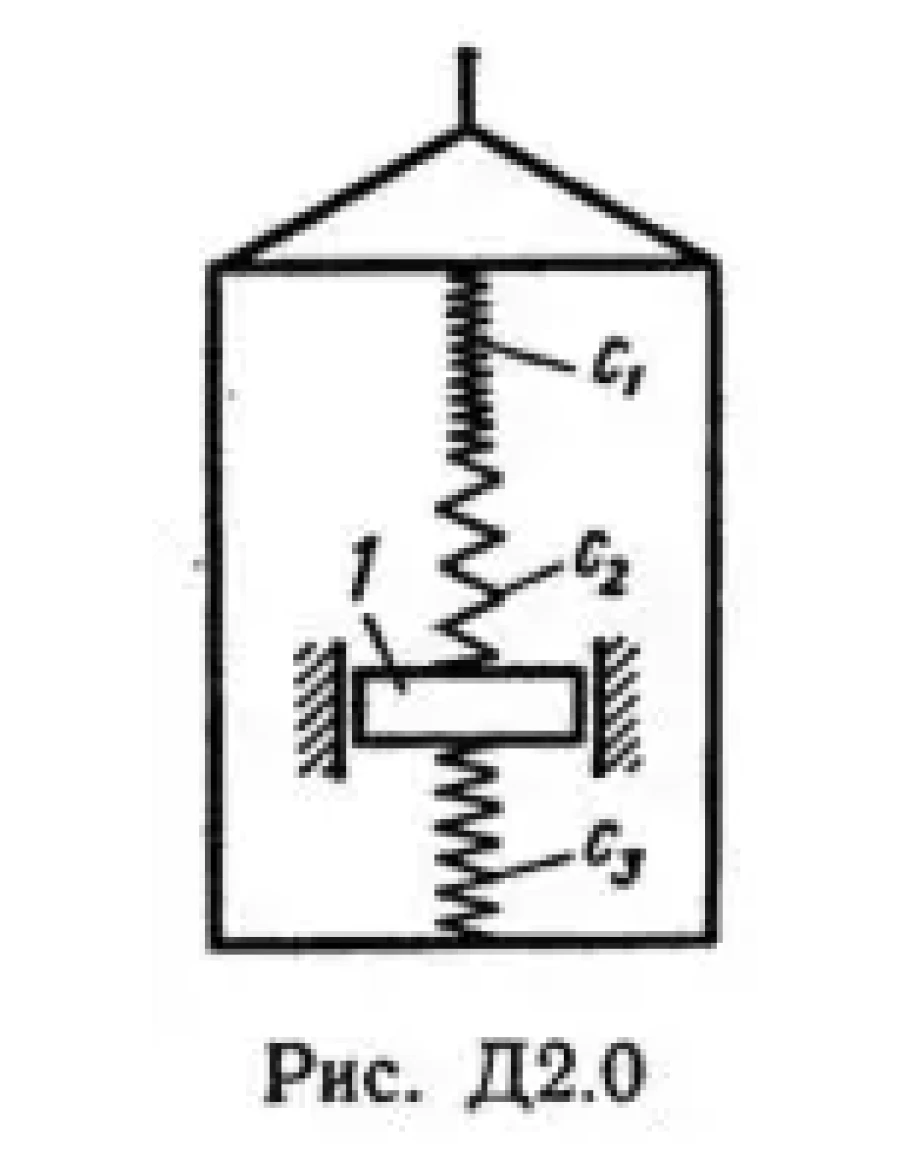 Груз 1 массой m укреплен на пружинной подвеске в лифте (рис. Д2.0 — Д2.9, табл. Д2). Лифт движется вертикально по закону z = 0,5α1t2 + α2sin(ωt) + α3cos(ωt) (ось z направлена по вертикали вверх; z выражено в метрах, t — в секундах). На груз действует сила сопротивления среды R = μv, где v — скорость груза по отношению к лифту. Найти закон движения груза по отношению к лифту, т. е. х = f(t); начало координат поместить в точке, где находится прикрепленный к грузу конец пружины, когда пружина не деформирована. При этом во избежание ошибок в знаках направить ось х в сторону удлинения пружины, а груз изобразить в положении, при котором х>0, т.е. пружина растянута. При подсчетах можно принять g = 10 м/с2. Массой пружин и соединительной планки 2 пренебречь. В таблице обозначено: c1, с2, c3 — коэффициенты жесткости пружин, λ0 — удлинение пружины с эквивалентной жесткостью в начальный момент времени t = 0, v0 — начальная скорость груза по отношению к лифту (направлена вертикально вверх). Прочерк в столбцах c1, с2, c3 означает, что соответствующая пружина отсутствует и на чертеже изображаться не должна. Если при этом конец одной из оставшихся пружин окажется свободным, его следует прикрепить в соответствующем месте или к грузу или к потолку (полу) лифта; то же следует сделать, если свободными окажутся соединенные планкой 2 концы обеих оставшихся пружин. Условие μ = 0 означает, что сила сопротивления R отсутствует.