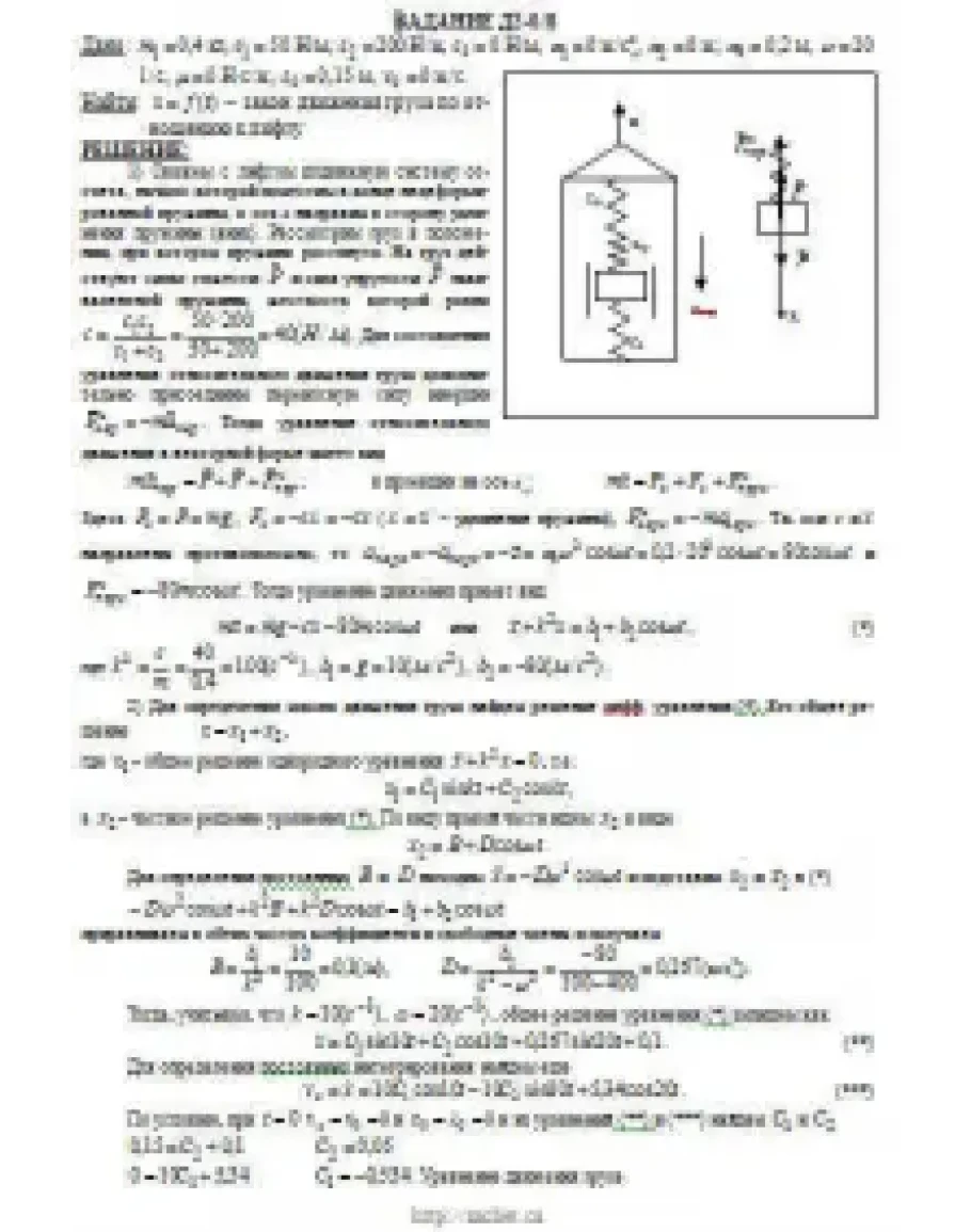 Груз 1 массой m укреплен на пружинной подвеске в лифте (рис. Д2.0 — Д2.9, табл. Д2). Лифт движется вертикально по закону z = 0,5α1t2 + α2sin(ωt) + α3cos(ωt) (ось z направлена по вертикали вверх; z выражено в метрах, t — в секундах). На груз действует сила сопротивления среды R = μv, где v — скорость груза по отношению к лифту. Найти закон движения груза по отношению к лифту, т. е. х = f(t); начало координат поместить в точке, где находится прикрепленный к грузу конец пружины, когда пружина не деформирована. При этом во избежание ошибок в знаках направить ось х в сторону удлинения пружины, а груз изобразить в положении, при котором х>0, т.е. пружина растянута. При подсчетах можно принять g = 10 м/с2. Массой пружин и соединительной планки 2 пренебречь. В таблице обозначено: c1, с2, c3 — коэффициенты жесткости пружин, λ0 — удлинение пружины с эквивалентной жесткостью в начальный момент времени t = 0, v0 — начальная скорость груза по отношению к лифту (направлена вертикально вверх). Прочерк в столбцах c1, с2, c3 означает, что соответствующая пружина отсутствует и на чертеже изображаться не должна. Если при этом конец одной из оставшихся пружин окажется свободным, его следует прикрепить в соответствующем месте или к грузу или к потолку (полу) лифта; то же следует сделать, если свободными окажутся соединенные планкой 2 концы обеих оставшихся пружин. Условие μ = 0 означает, что сила сопротивления R отсутствует.