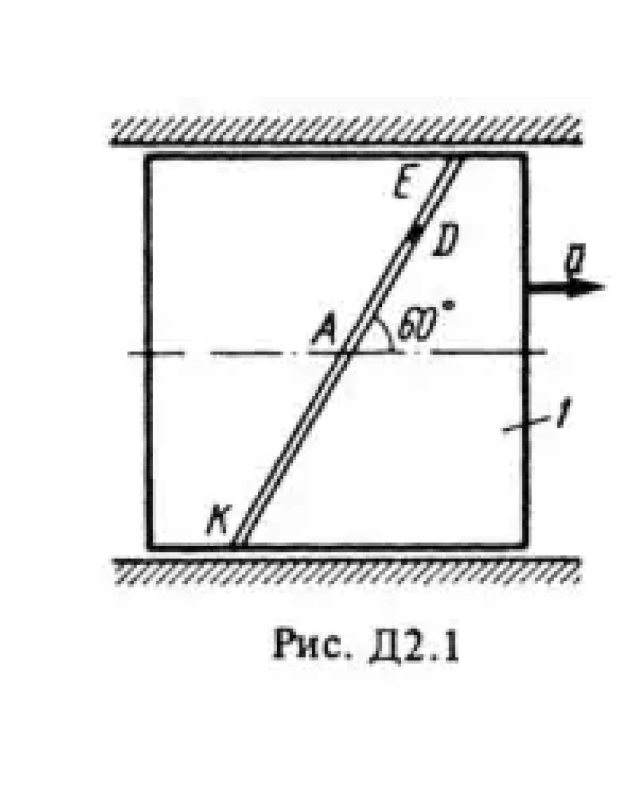 Механическая система состоит из прямоугольной вертикальной плиты 1 массой m1 = 24 кг и груза D массой m2 = 8 кг; плита или движется вокруг горизонтальных направляющий (рис. Д2.0-Д2.4), или вращается вокруг вертикальной оси z, лежащей в плоскости плиты (рис. Д2.5-Д2.9). В момент времени t0 = 0 груз начинает двигаться под действием внутренних сил по имеющемуся на плите желобу; закон его движения s = AD = F(t) задан в табл. Д2, где s выражено в метрах, t – в секундах. Форма желоба на рис. Д2.0, Д2.1, Д2.8, Д2.9 – прямолинейная (желоб КЕ), на рис. Д2.2-Д2.7 – окружность радиуса R = 0,8 м с центром в центре масс C1 плиты (s = AD на рис. Д2.2 - Д2.7 отсчитывается по дуге окружности). Плита (рис. Д2.0-Д2.4) имеет в момент t0 = 0 скорость v0 = 0. Плита (рис Д2.5-Д2.9) имеет в момент времени t0 = 0 угловую скорость ω0 = 8 с-1, и в этот момент на нее начинает действовать вращательный момент М (момент относительно оси), заданный в таблице в ньютонометрах и направленный как ω0 при М > 0 и в противоположную сторону при М < 0. Ось z проходит от центра C1 плиты на расстоянии b; размеры плиты показаны на рисунках. Считая грузы материальной точкой и пренебрегая всеми сопротивлениями, определить указанное в таблице в столбцах 4 и 9, где обозначено: в столбце 4 (относится к рис. Д2.0-Д2.4) x1 – перемещение плиты за время от t0 = 0 до t1 = 1 с, v – скорость плиты в момент времени t1 = 1 с, N – полная сила нормального давления плиты на направляющие в момент времени t = 1 с (указать, куда сила направлена); в столбце 9 (относится к рис. 5-9) ω1 – угловая скорость плиты в момент времени t1 = 1 с, ω = f(t) – угловая скорость плиты как функция времени. На всех рисунках груз показан в положении, при котором s = AD > 0; при x < 0 груз находится по другую сторону от точки А.