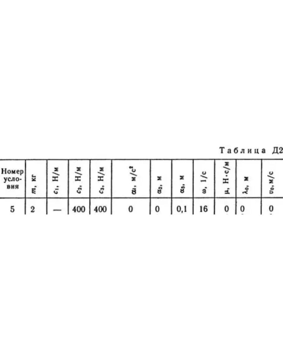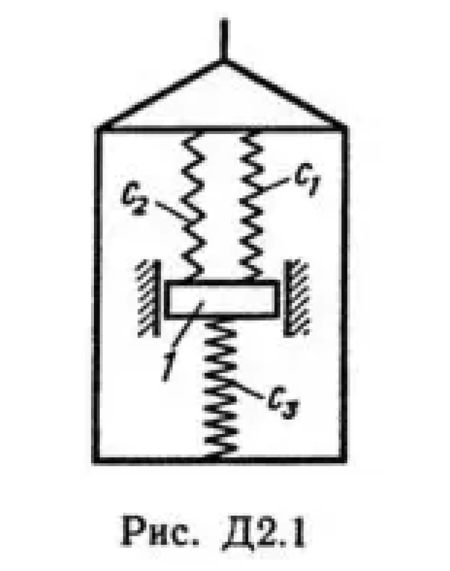 Груз 1 массой m укреплен на пружинной подвеске в лифте (рис. Д2.0 — Д2.9, табл. Д2). Лифт движется вертикально по закону z = 0,5α1t2 + α2sin(ωt) + α3cos(ωt) (ось z направлена по вертикали вверх; z выражено в метрах, t — в секундах). На груз действует сила сопротивления среды R = μv, где v — скорость груза по отношению к лифту. Найти закон движения груза по отношению к лифту, т. е. х = f(t); начало координат поместить в точке, где находится прикрепленный к грузу конец пружины, когда пружина не деформирована. При этом во избежание ошибок в знаках направить ось х в сторону удлинения пружины, а груз изобразить в положении, при котором х>0, т.е. пружина растянута. При подсчетах можно принять g = 10 м/с2. Массой пружин и соединительной планки 2 пренебречь. В таблице обозначено: c1, с2, c3 — коэффициенты жесткости пружин, λ0 — удлинение пружины с эквивалентной жесткостью в начальный момент времени t = 0, v0 — начальная скорость груза по отношению к лифту (направлена вертикально вверх). Прочерк в столбцах c1, с2, c3 означает, что соответствующая пружина отсутствует и на чертеже изображаться не должна. Если при этом конец одной из оставшихся пружин окажется свободным, его следует прикрепить в соответствующем месте или к грузу или к потолку (полу) лифта; то же следует сделать, если свободными окажутся соединенные планкой 2 концы обеих оставшихся пружин. Условие μ = 0 означает, что сила сопротивления R отсутствует.