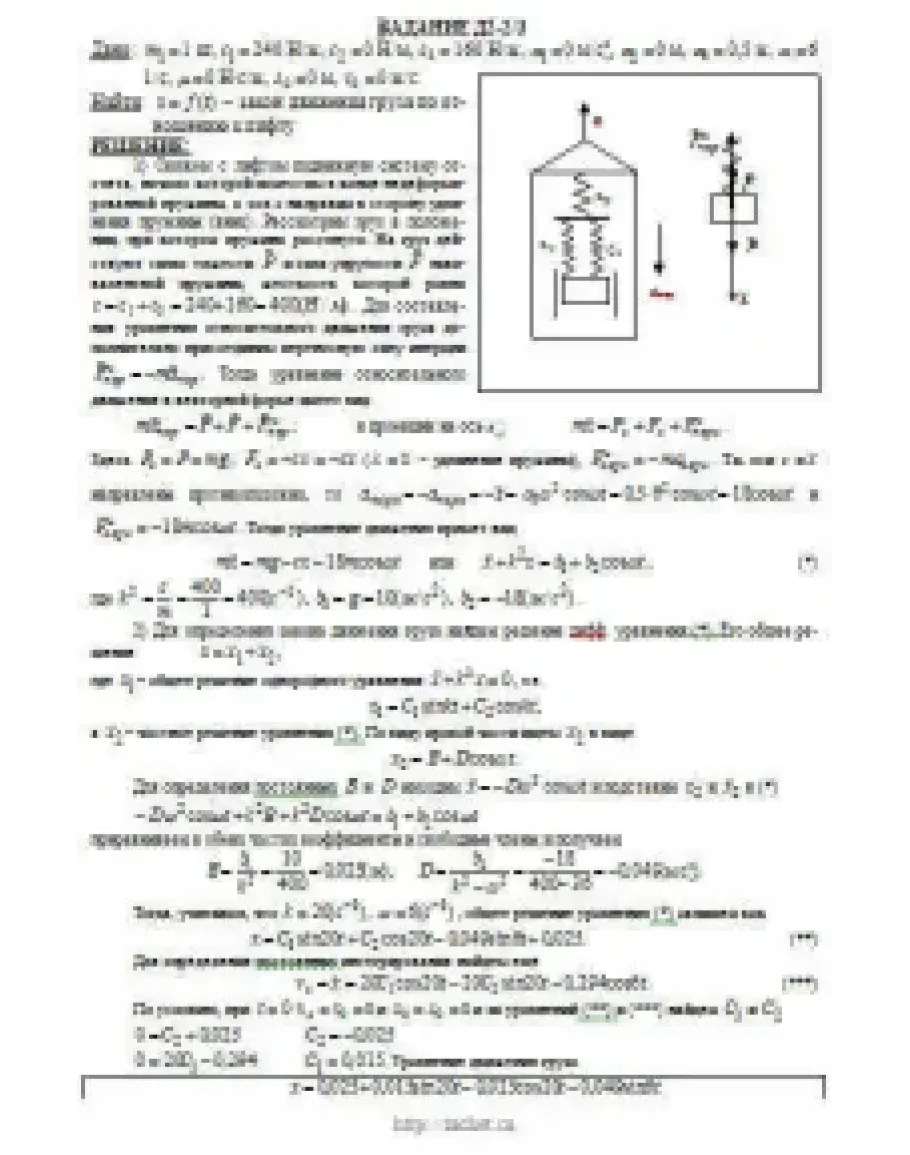 Груз 1 массой m укреплен на пружинной подвеске в лифте (рис. Д2.0 — Д2.9, табл. Д2). Лифт движется вертикально по закону z = 0,5α1t2 + α2sin(ωt) + α3cos(ωt) (ось z направлена по вертикали вверх; z выражено в метрах, t — в секундах). На груз действует сила сопротивления среды R = μv, где v — скорость груза по отношению к лифту. Найти закон движения груза по отношению к лифту, т. е. х = f(t); начало координат поместить в точке, где находится прикрепленный к грузу конец пружины, когда пружина не деформирована. При этом во избежание ошибок в знаках направить ось х в сторону удлинения пружины, а груз изобразить в положении, при котором х>0, т.е. пружина растянута. При подсчетах можно принять g = 10 м/с2. Массой пружин и соединительной планки 2 пренебречь. В таблице обозначено: c1, с2, c3 — коэффициенты жесткости пружин, λ0 — удлинение пружины с эквивалентной жесткостью в начальный момент времени t = 0, v0 — начальная скорость груза по отношению к лифту (направлена вертикально вверх). Прочерк в столбцах c1, с2, c3 означает, что соответствующая пружина отсутствует и на чертеже изображаться не должна. Если при этом конец одной из оставшихся пружин окажется свободным, его следует прикрепить в соответствующем месте или к грузу или к потолку (полу) лифта; то же следует сделать, если свободными окажутся соединенные планкой 2 концы обеих оставшихся пружин. Условие μ = 0 означает, что сила сопротивления R отсутствует.