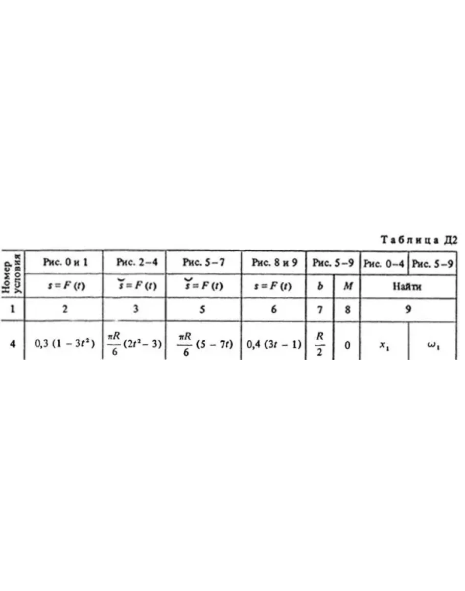 Механическая система состоит из прямоугольной вертикальной плиты 1 массой m1 = 24 кг и груза D массой m2 = 8 кг; плита или движется вокруг горизонтальных направляющий (рис. Д2.0-Д2.4), или вращается вокруг вертикальной оси z, лежащей в плоскости плиты (рис. Д2.5-Д2.9). В момент времени t0 = 0 груз начинает двигаться под действием внутренних сил по имеющемуся на плите желобу; закон его движения s = AD = F(t) задан в табл. Д2, где s выражено в метрах, t – в секундах. Форма желоба на рис. Д2.0, Д2.1, Д2.8, Д2.9 – прямолинейная (желоб КЕ), на рис. Д2.2-Д2.7 – окружность радиуса R = 0,8 м с центром в центре масс C1 плиты (s = AD на рис. Д2.2 - Д2.7 отсчитывается по дуге окружности). Плита (рис. Д2.0-Д2.4) имеет в момент t0 = 0 скорость v0 = 0. Плита (рис Д2.5-Д2.9) имеет в момент времени t0 = 0 угловую скорость ω0 = 8 с-1, и в этот момент на нее начинает действовать вращательный момент М (момент относительно оси), заданный в таблице в ньютонометрах и направленный как ω0 при М > 0 и в противоположную сторону при М < 0. Ось z проходит от центра C1 плиты на расстоянии b; размеры плиты показаны на рисунках. Считая грузы материальной точкой и пренебрегая всеми сопротивлениями, определить указанное в таблице в столбцах 4 и 9, где обозначено: в столбце 4 (относится к рис. Д2.0-Д2.4) x1 – перемещение плиты за время от t0 = 0 до t1 = 1 с, v – скорость плиты в момент времени t1 = 1 с, N – полная сила нормального давления плиты на направляющие в момент времени t = 1 с (указать, куда сила направлена); в столбце 9 (относится к рис. 5-9) ω1 – угловая скорость плиты в момент времени t1 = 1 с, ω = f(t) – угловая скорость плиты как функция времени. На всех рисунках груз показан в положении, при котором s = AD > 0; при x < 0 груз находится по другую сторону от точки А.