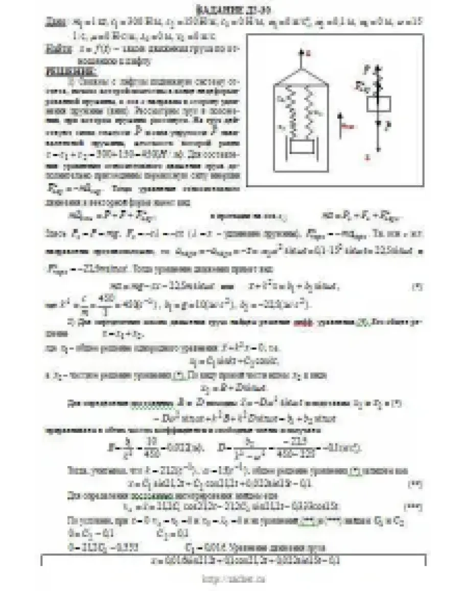 Груз 1 массой m укреплен на пружинной подвеске в лифте (рис. Д2.0 — Д2.9, табл. Д2). Лифт движется вертикально по закону z = 0,5α1t2 + α2sin(ωt) + α3cos(ωt) (ось z направлена по вертикали вверх; z выражено в метрах, t — в секундах). На груз действует сила сопротивления среды R = μv, где v — скорость груза по отношению к лифту. Найти закон движения груза по отношению к лифту, т. е. х = f(t); начало координат поместить в точке, где находится прикрепленный к грузу конец пружины, когда пружина не деформирована. При этом во избежание ошибок в знаках направить ось х в сторону удлинения пружины, а груз изобразить в положении, при котором х>0, т.е. пружина растянута. При подсчетах можно принять g = 10 м/с2. Массой пружин и соединительной планки 2 пренебречь. В таблице обозначено: c1, с2, c3 — коэффициенты жесткости пружин, λ0 — удлинение пружины с эквивалентной жесткостью в начальный момент времени t = 0, v0 — начальная скорость груза по отношению к лифту (направлена вертикально вверх). Прочерк в столбцах c1, с2, c3 означает, что соответствующая пружина отсутствует и на чертеже изображаться не должна. Если при этом конец одной из оставшихся пружин окажется свободным, его следует прикрепить в соответствующем месте или к грузу или к потолку (полу) лифта; то же следует сделать, если свободными окажутся соединенные планкой 2 концы обеих оставшихся пружин. Условие μ = 0 означает, что сила сопротивления R отсутствует.