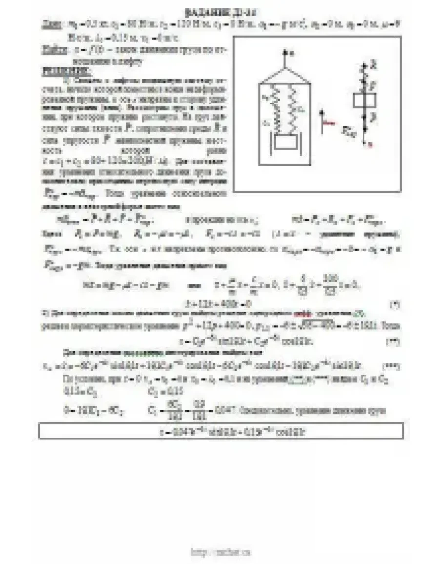 Груз 1 массой m укреплен на пружинной подвеске в лифте (рис. Д2.0 — Д2.9, табл. Д2). Лифт движется вертикально по закону z = 0,5α1t2 + α2sin(ωt) + α3cos(ωt) (ось z направлена по вертикали вверх; z выражено в метрах, t — в секундах). На груз действует сила сопротивления среды R = μv, где v — скорость груза по отношению к лифту. Найти закон движения груза по отношению к лифту, т. е. х = f(t); начало координат поместить в точке, где находится прикрепленный к грузу конец пружины, когда пружина не деформирована. При этом во избежание ошибок в знаках направить ось х в сторону удлинения пружины, а груз изобразить в положении, при котором х>0, т.е. пружина растянута. При подсчетах можно принять g = 10 м/с2. Массой пружин и соединительной планки 2 пренебречь. В таблице обозначено: c1, с2, c3 — коэффициенты жесткости пружин, λ0 — удлинение пружины с эквивалентной жесткостью в начальный момент времени t = 0, v0 — начальная скорость груза по отношению к лифту (направлена вертикально вверх). Прочерк в столбцах c1, с2, c3 означает, что соответствующая пружина отсутствует и на чертеже изображаться не должна. Если при этом конец одной из оставшихся пружин окажется свободным, его следует прикрепить в соответствующем месте или к грузу или к потолку (полу) лифта; то же следует сделать, если свободными окажутся соединенные планкой 2 концы обеих оставшихся пружин. Условие μ = 0 означает, что сила сопротивления R отсутствует.